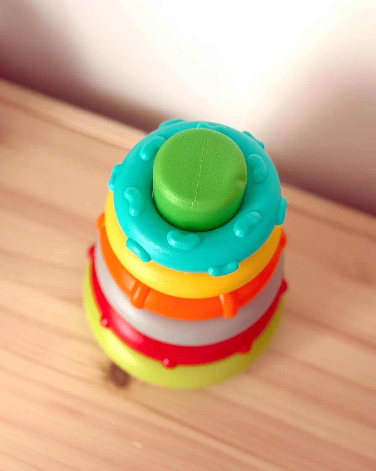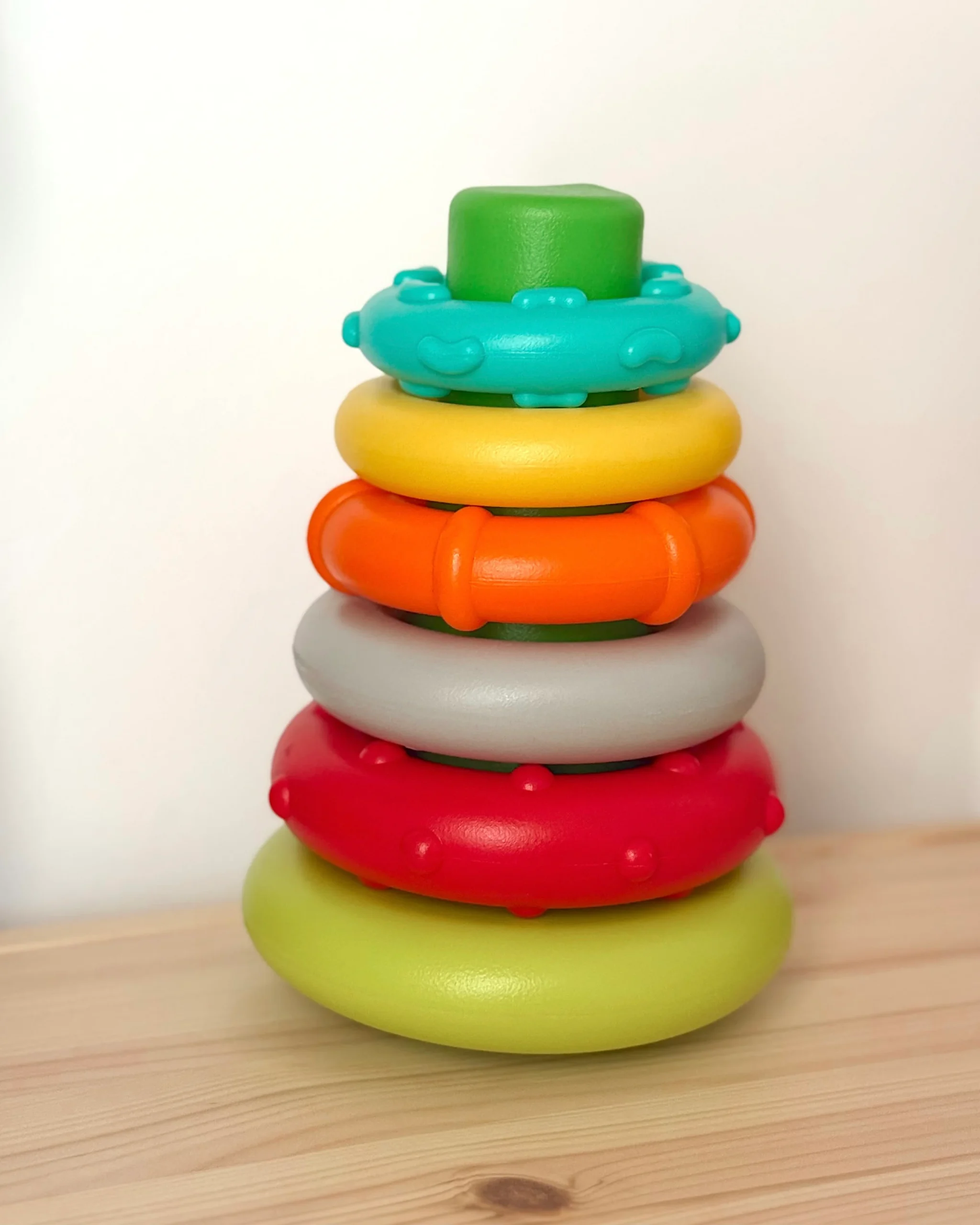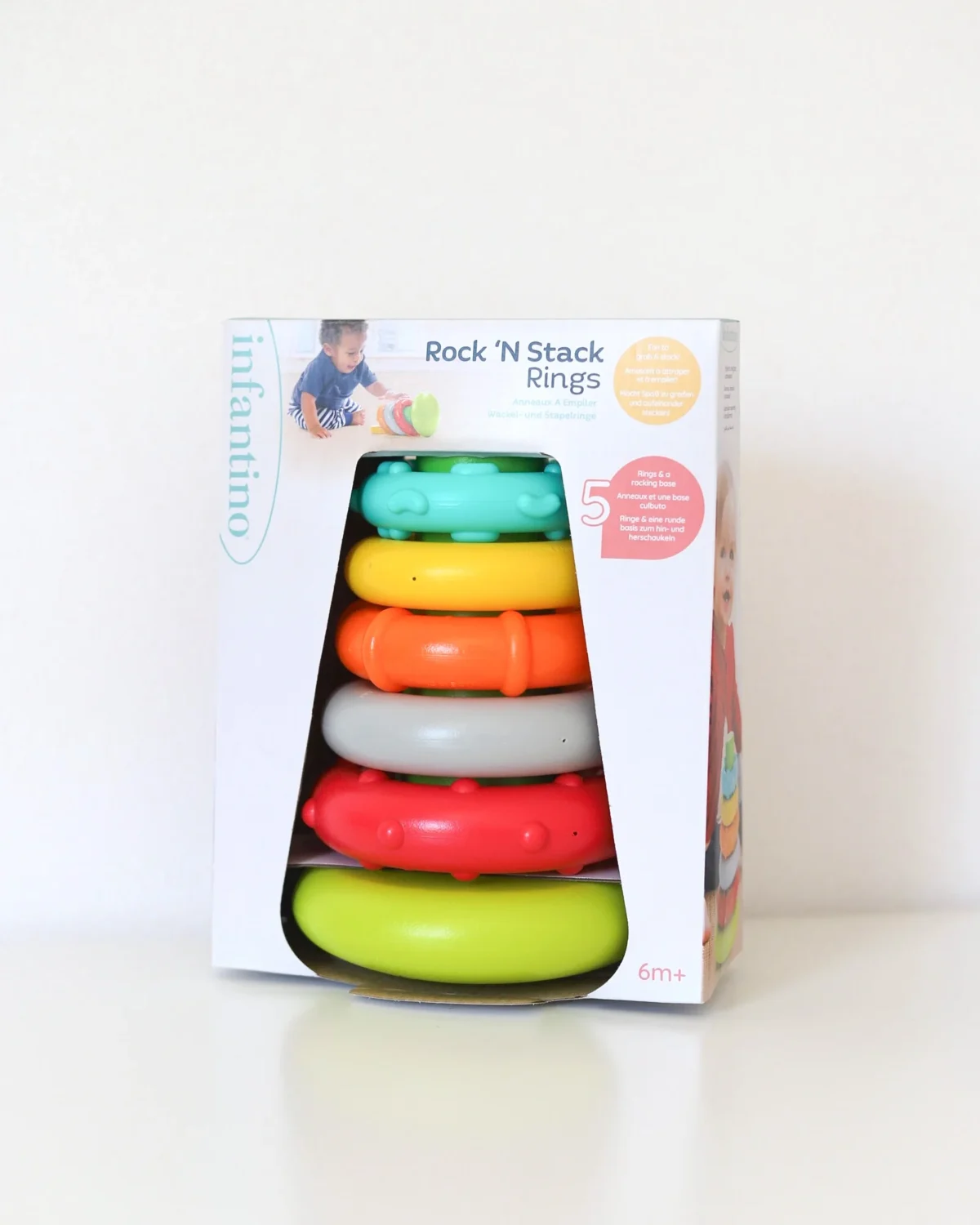 Brend infantino napravio je jednostavnu igračku, sa plastičnim prstenovima koji se slažu na bazu, a bebu privlače i teksturom i oblikom i bojama.