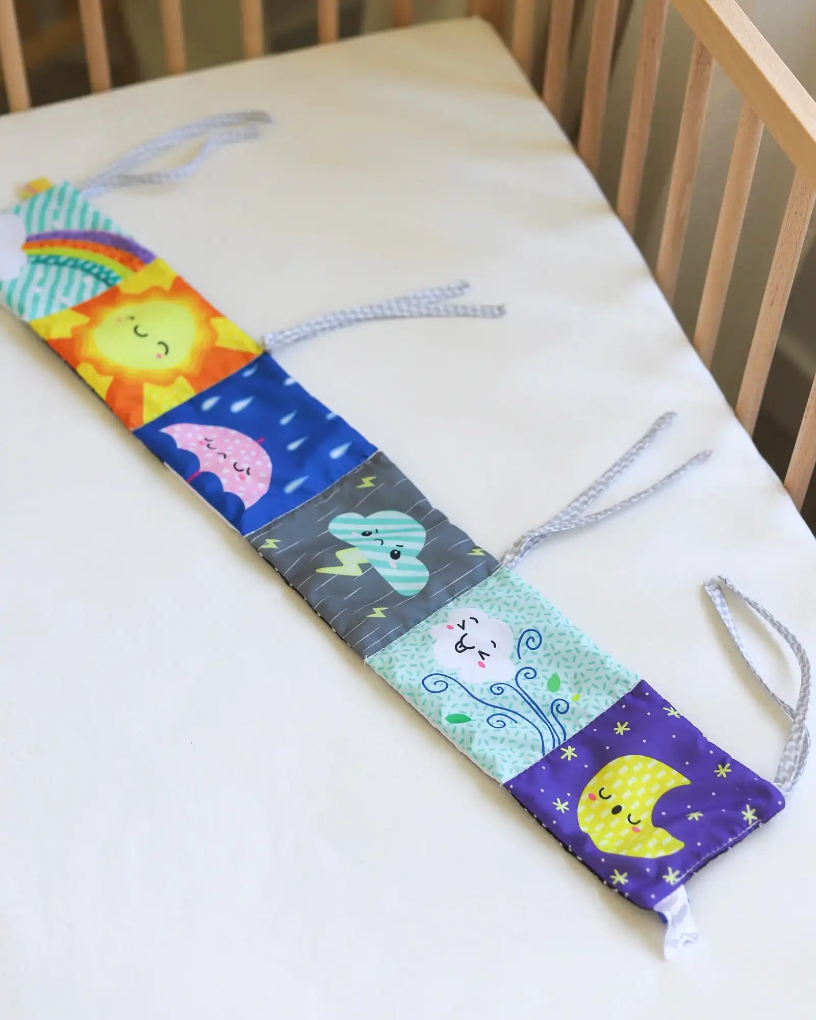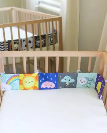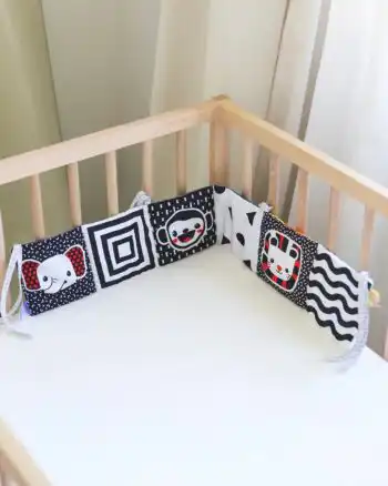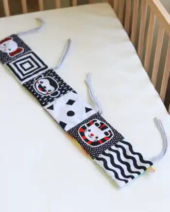 Edukativna ogradica koja će bebi dugo biti zanimljiva, jer ima dve strane! Jedna je sa crno-belim i crvenim tonovima (0-3 meseca), a druga sa šarenim jarkim bojama (3+ meseci). Plus, ima polje koje šuška i polje koje na pritisak „pišti“, tako da je jedna od onih igračaka koje, posebno u prvim mesecima, dugo drže pažnju. Možeš je zavezati za krevetac, ili je jednostavno postaviti na podlogu na kojoj beba leži. Sjajna je za tummy time, kada nam je potrebno nešto što će okupirati bebu dok leži na stomaku.