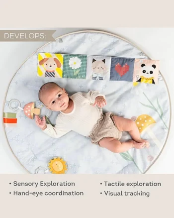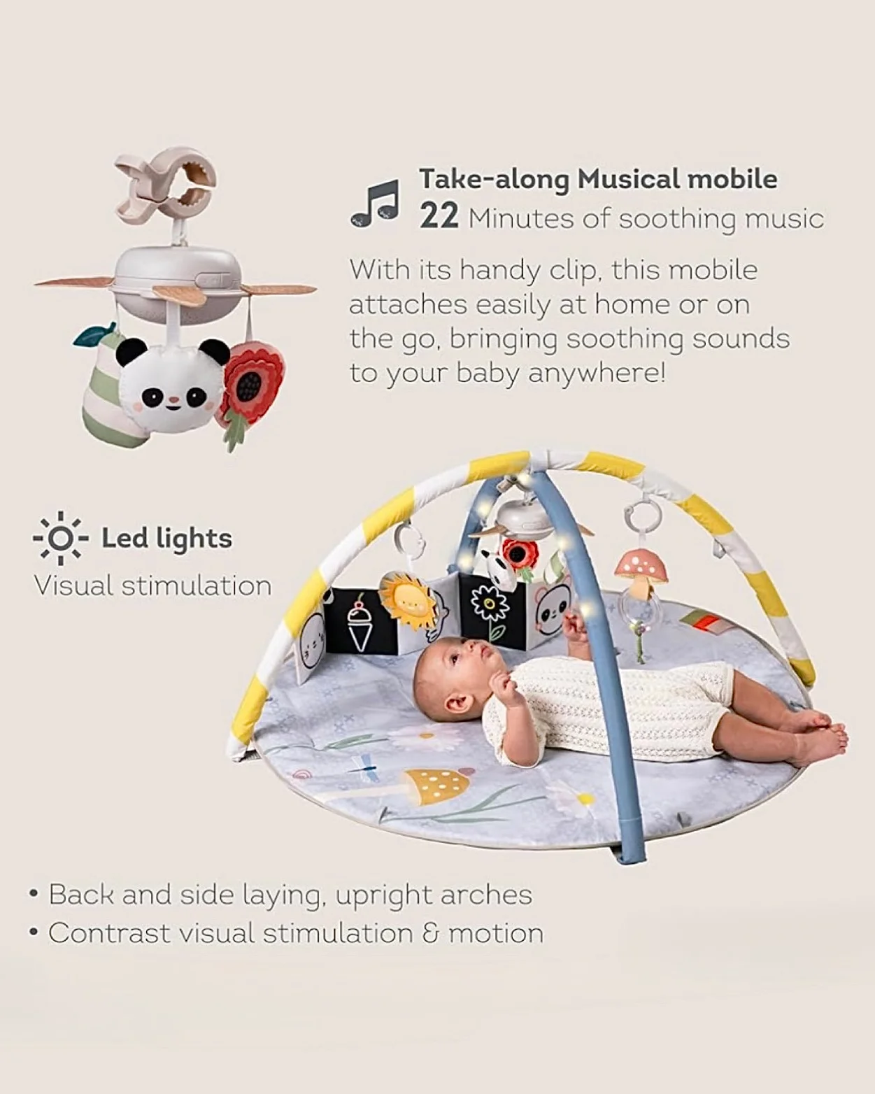 Taf Toys gimnastika razlikuje se od klasičnih, po tome što ima integrisane lampice i muzičku vrtešku i tako, pored igre, podstiče i slušnu i vizuelnu stimulaciju. Pored toga, u ovom kompletu nalazi se i dvostrana šuškava knjiga koja je idealna za tummy time, kao i viseće zvečkice, i glodalice. Namenjena uzrastu od 0+ meseci.