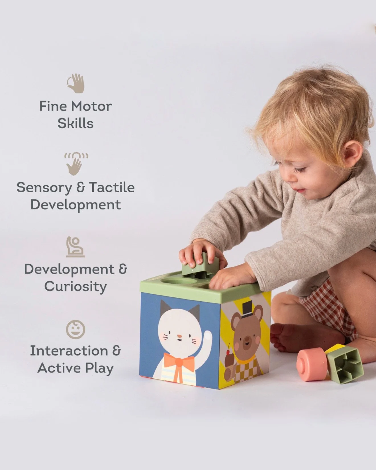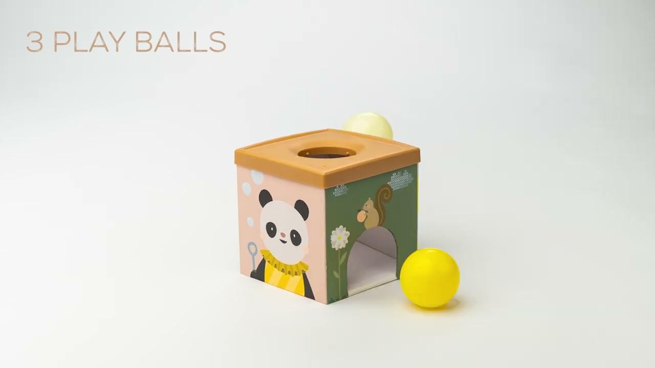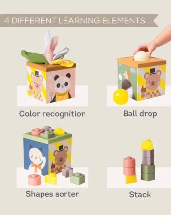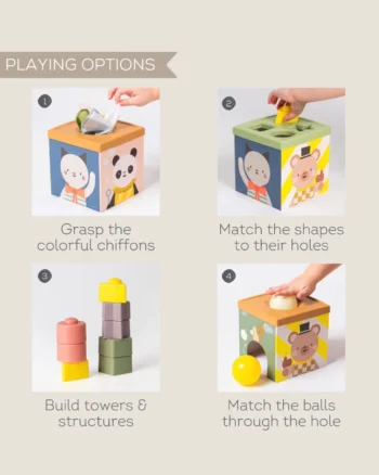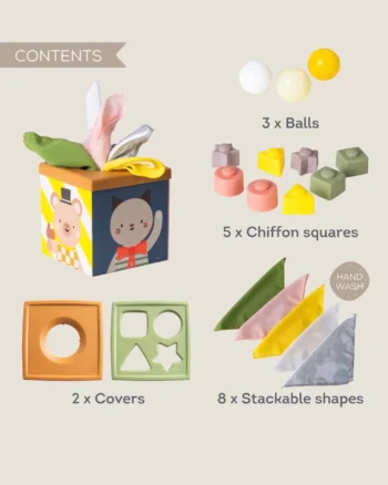 Ova kocka je multisenzorna igračka koja podstiče razvoj fine motorike i budi radoznalost kod mališana. Sadrži 3 loptice, 5 maramica od šifona, jednu kutiju od kartona, 8 oblika za ubacivanje, 2 stranice sa otvorima za ubacivanje. Namenjena za uzrast od 12+ meseci.
