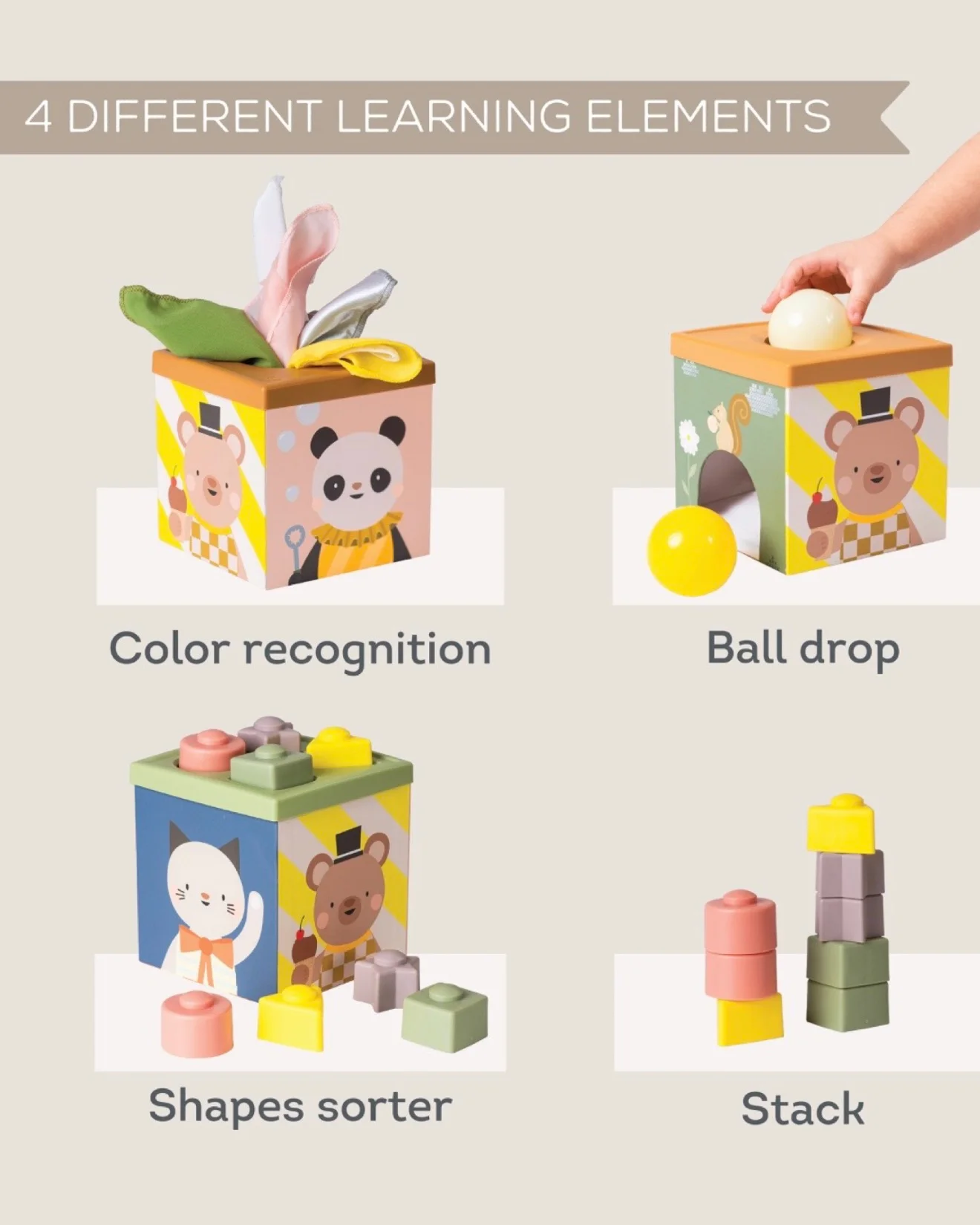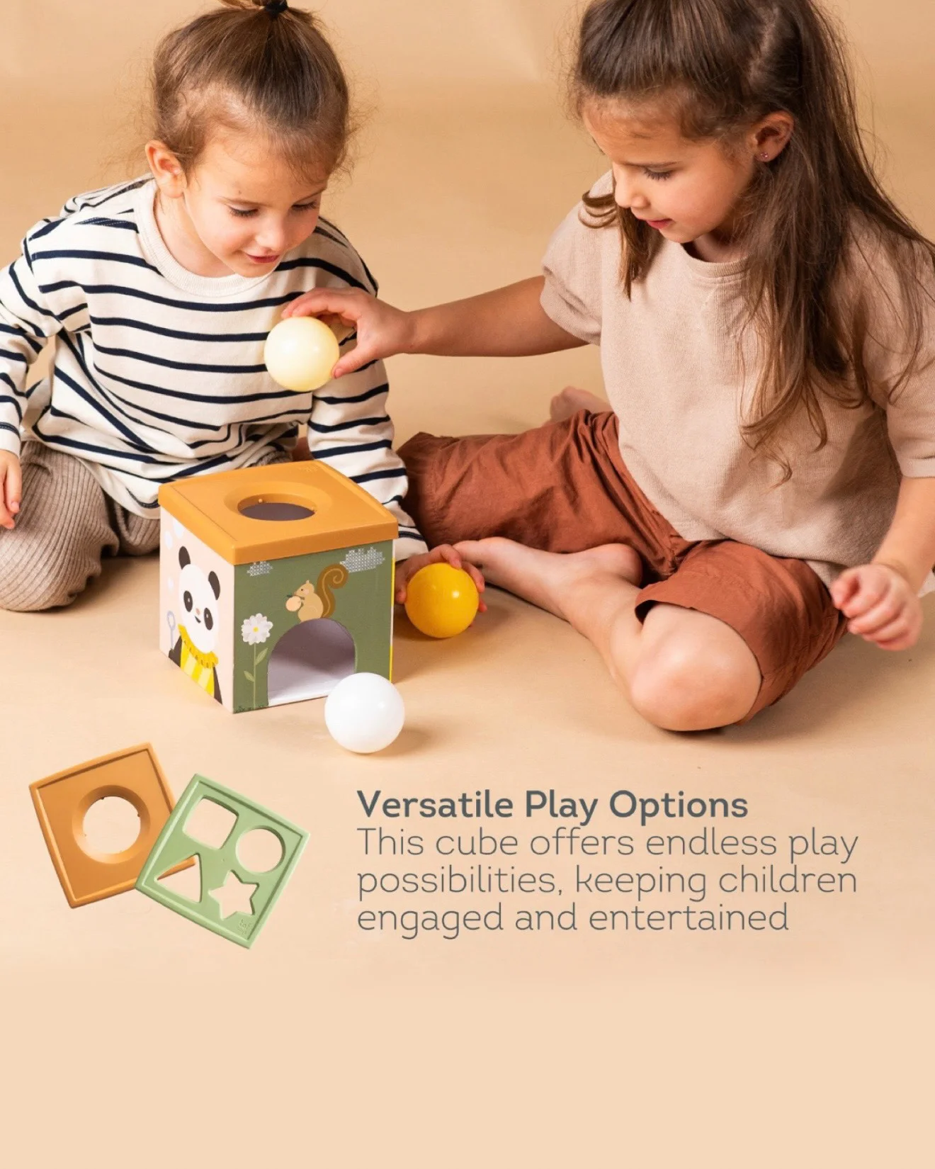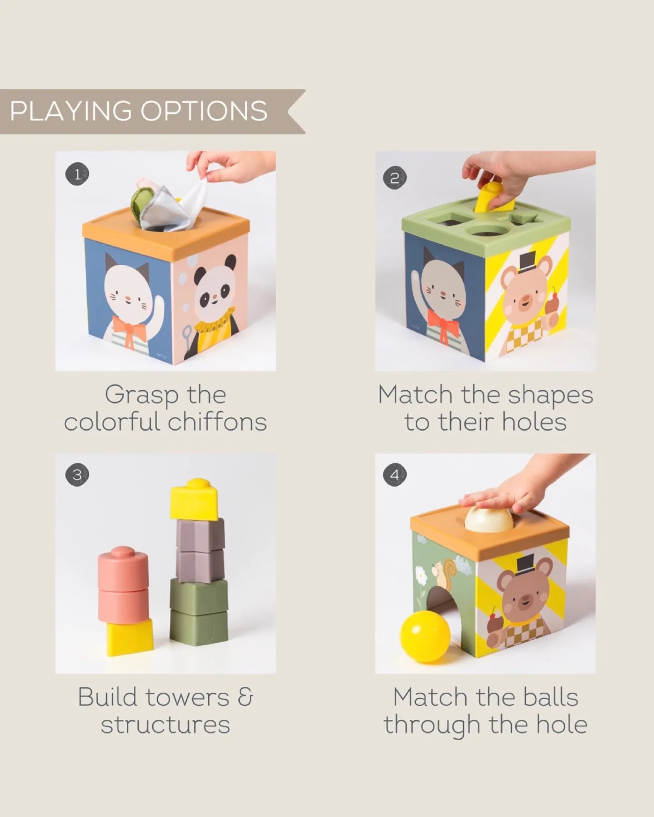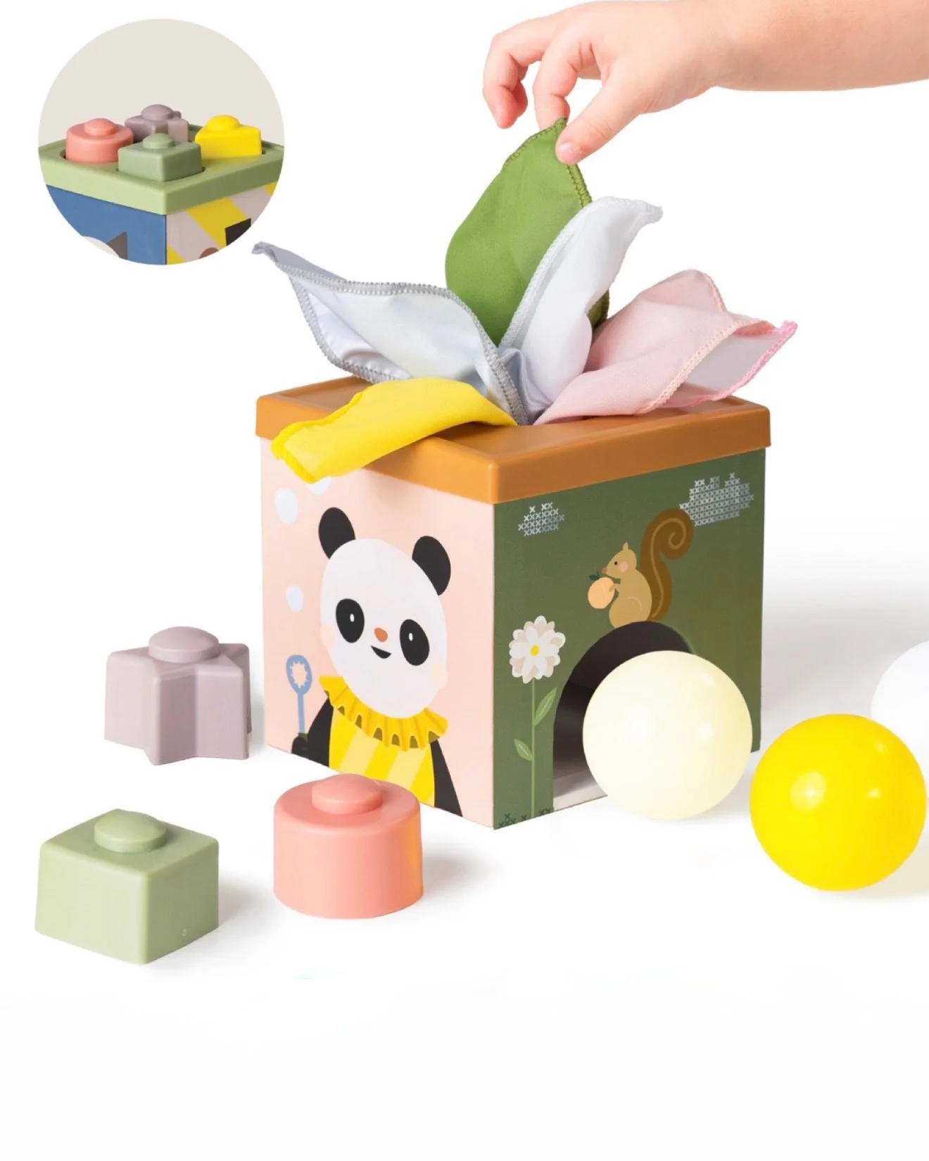 Raznovrsne opcije igre: Sa raznovrsnim komponentama, uključujući maramice, loptice i oblike koji se mogu slagati, kocka nudi beskrajne mogućnosti za maštovitu i kreativnu igru, zabavljajući mališane satima.