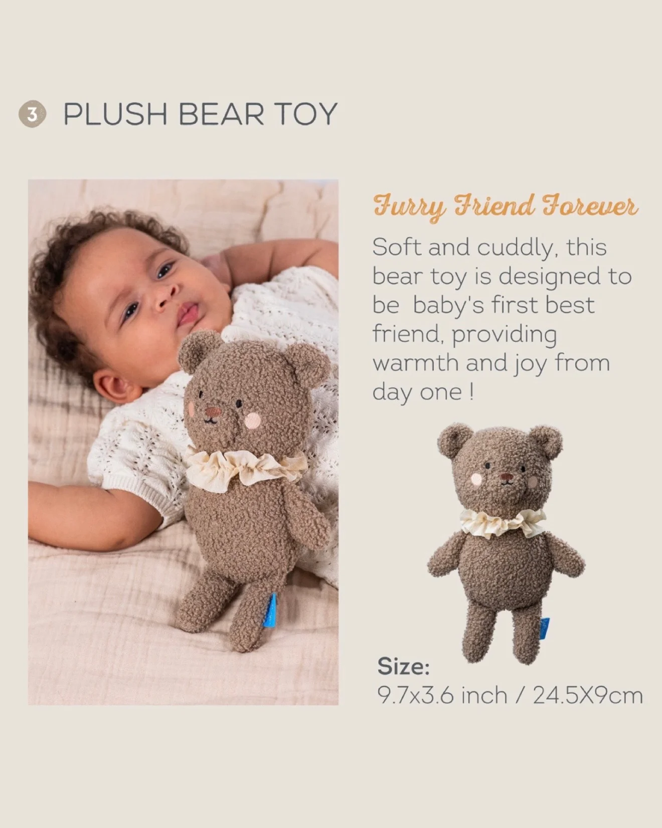 Emocionalna sigurnost: Plišani medved pruža emocionalnu sigurnost, pomažući bebama da se osećaju umireno i sigurno.