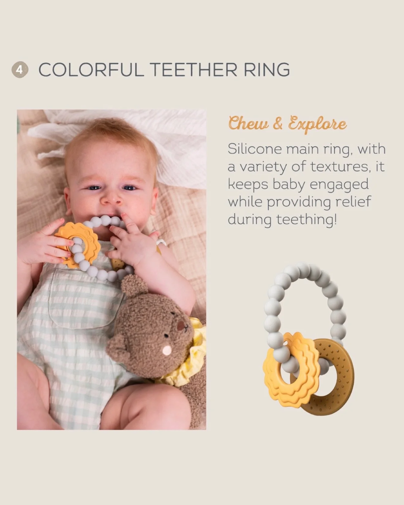 Taktilno istraživanje: Mekani plišani medved i teksturirane silikonske glodalice podstiču otkrivanja čula dodira, promovišući senzorni razvoj.