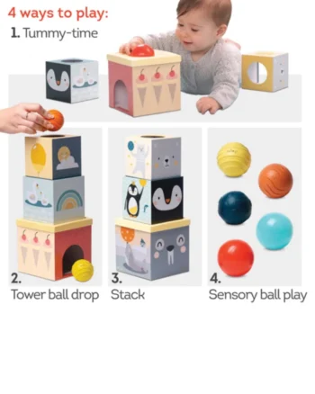TafToys kocke sa lopticama u kutiji zapravo sadrže: 3 kartonske kvadratne kutije u NorthPole dezenima + 2 glatke klasične loptice + 3 teksturirane senzorne loptice za ubacivanje ili samostalnu igru.