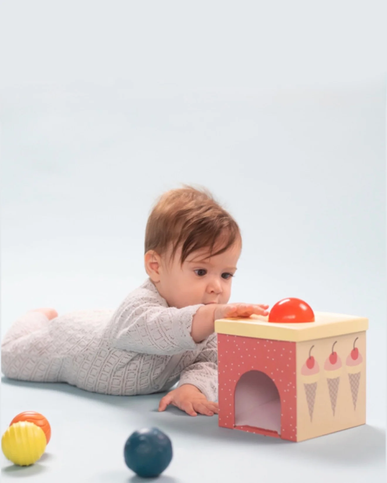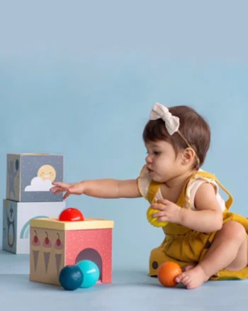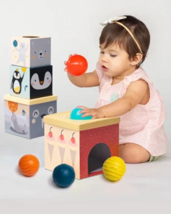 Bebe vole da se igraju skrivanja sa razlogom! Tada razvijaju sposobnost da znaju da predmeti idalje postoje, iako ih trenutno ne vide. Ova igra drži pažnju jer se beba svaki put iznenadi kada ispusti loptu u kutiju, kratkoročno je ne vidi i ona se magično pojavi nekoliko trenutaka kasnije. TafToys kocke sa lopticama možeš koristiti na 4 načina: