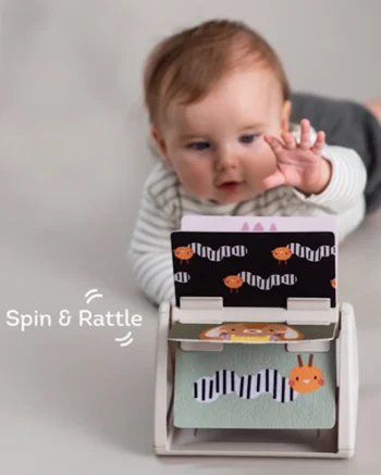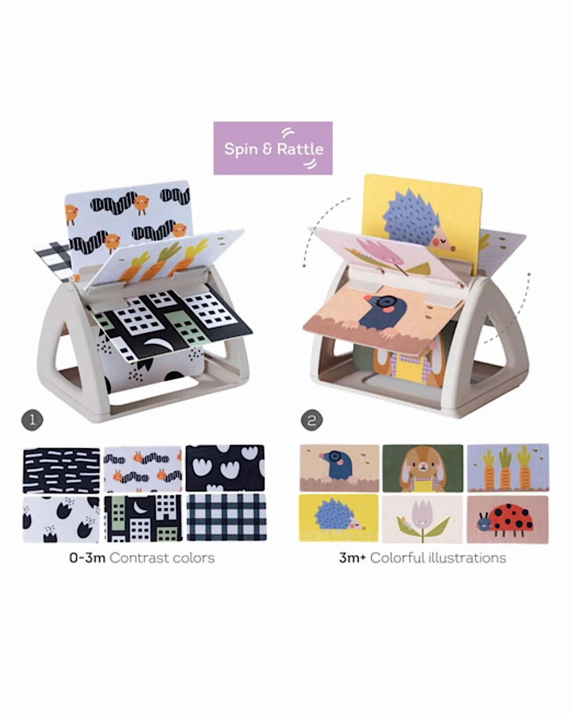 Rotirajuća knjiga sa dvostranim karticama, čije su ilustracije sa jedne strane kontrasne (crno-bele), a sa druge u šarenim bojama. Okretanjem stranica beba pravi zvuk zveckanja, učeći o uzroku i posledici!