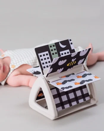 Faza 1: 0m+ – Vizuelna stimulacija – Boje visokog kontrasta i crteži omogućavaju bebi da se fokusira na jednu sliku u trenutku i minimizira stimulaciju iz okoline. Pomaže u razvoju bebinih čula i emocionalne inteligencije.
