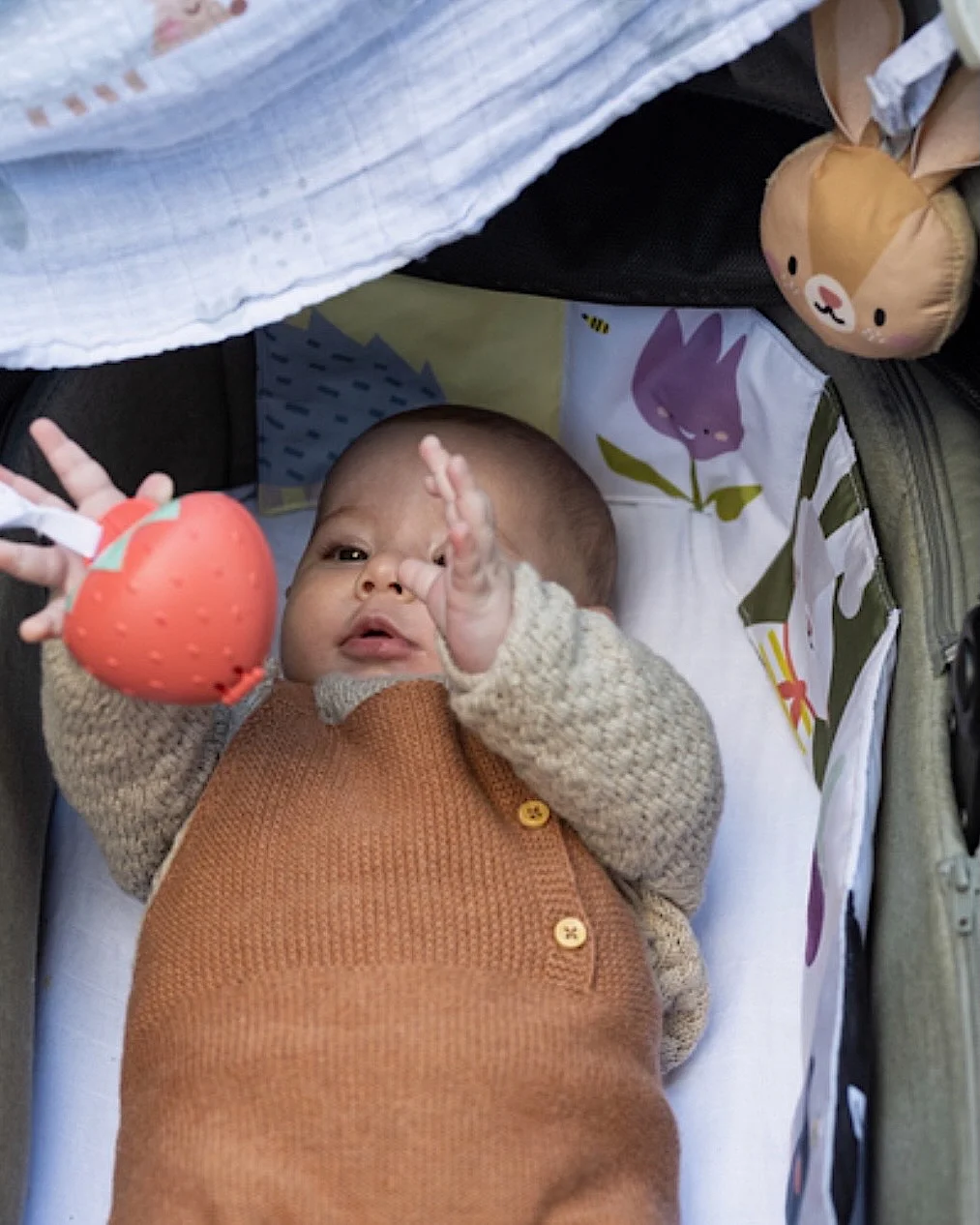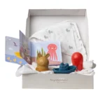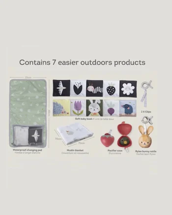 Ovaj „outdoor kit“ je savršen za sve roditelje koji vole da provode vreme sa bebom van kuće. Sadrži sve što ti je potrebno da bebi bude udobno, a i da sebi olakšaš život i svakodnevne aktivnosti kada nisi u kući. U kutiji se nalazi veliki swaddle, podlogu za presvlačenje koja ima džep sa sve potrebne sitnice (pelenu, maramice, kremicu) a sklapa se u lako prenosivu torbicu, dve plastične štipaljke (koje drže pelenu na kolicima u mestu, i kada duva vetar), kutiju za cuclu u obliku jagodice, šuškavog zeku koji se kači, dvostranu knjigu za bebe koja se rasklapa (može biti crno/bela ili šarena).