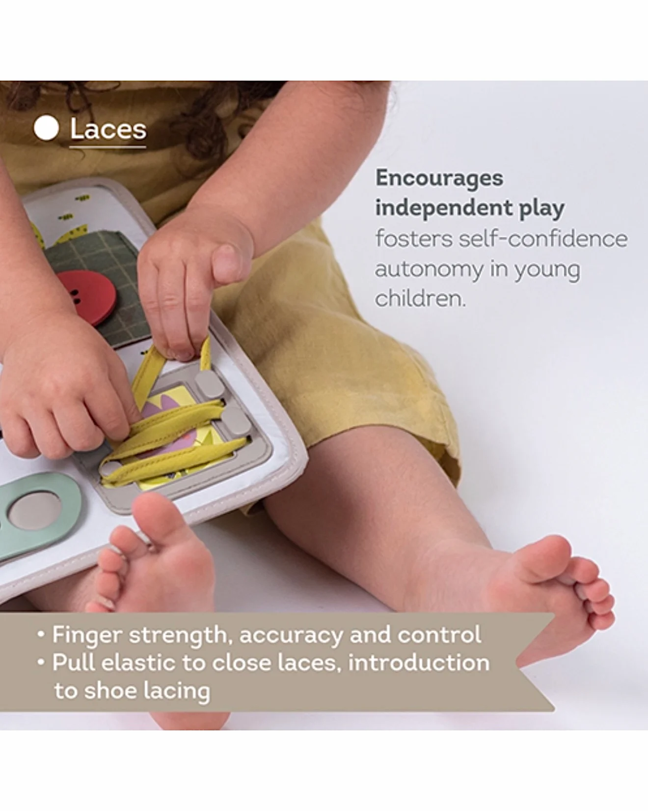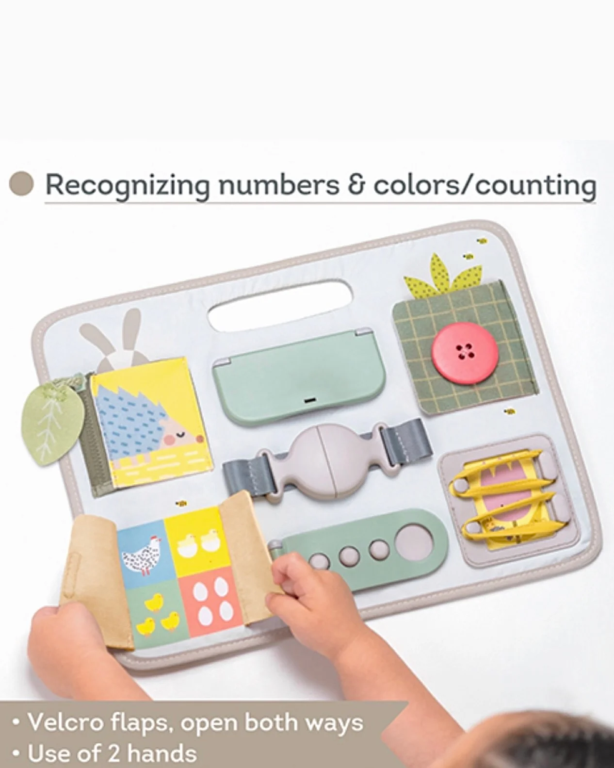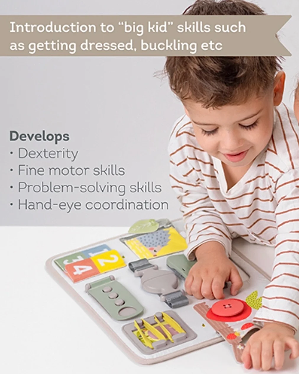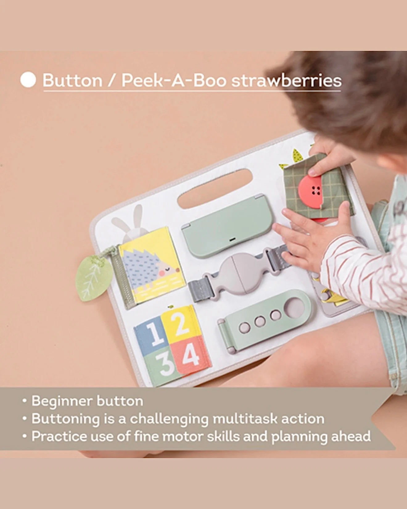 Taf Toys tabla aktivnosti namenjena je uzrastu od 18+ meseci i jedna je od onih igračaka koja osim zabave, podstiče razvoj različitih veština kod deteta. Aktivnosti uključuju: korišćenje rajsferšlusa, XL dugmeta, čička, pertli, dve vrste kopčanja, aktivnosti skrivanja (peek-a-boo), učenju brojanja, oblika i boja. Igračka je dizajnirana da poboljša finu motoriku, spretnost, sposobnost rešavanja problema i koordinaciju oko-ruka.