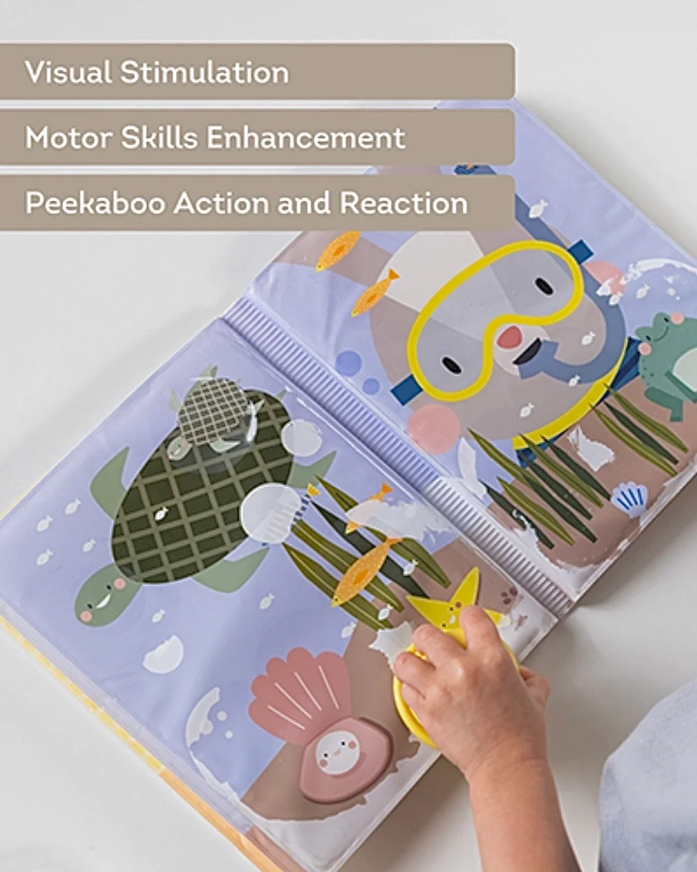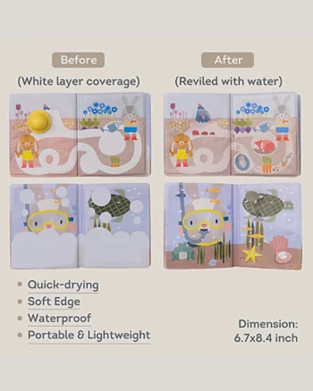 Akcija i reakcija „peek-a-boo“: Sa funkcijom otkrivanja boja „peek-a-boo“, naša vodena knjiga podstiče bebe da istražuju uzročno-posledične veze. Dok otkrivaju skrivene ilustracije, otkrivaju iznenađenja i uče o posledicama svojih postupaka, podstičući kognitivni razvoj i radoznalost.