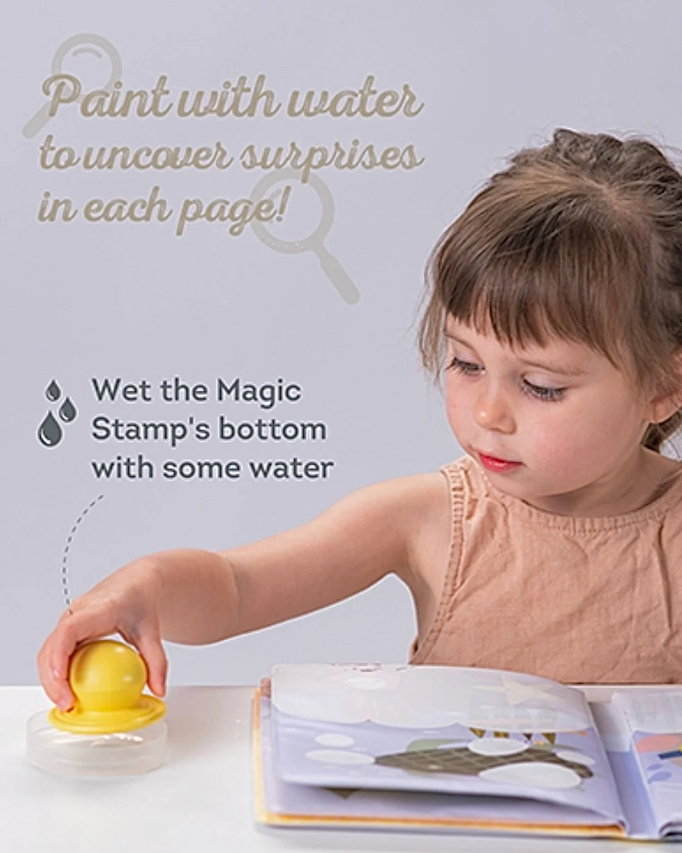 Živopisne ilustracije otkrivaju se kada sakriveni beli delovi na stranicama dođu u kontakt sa vodom. Dete mokrim pečatom prelazi preko njih, i uz maštu zagarantovana je duga zabava.