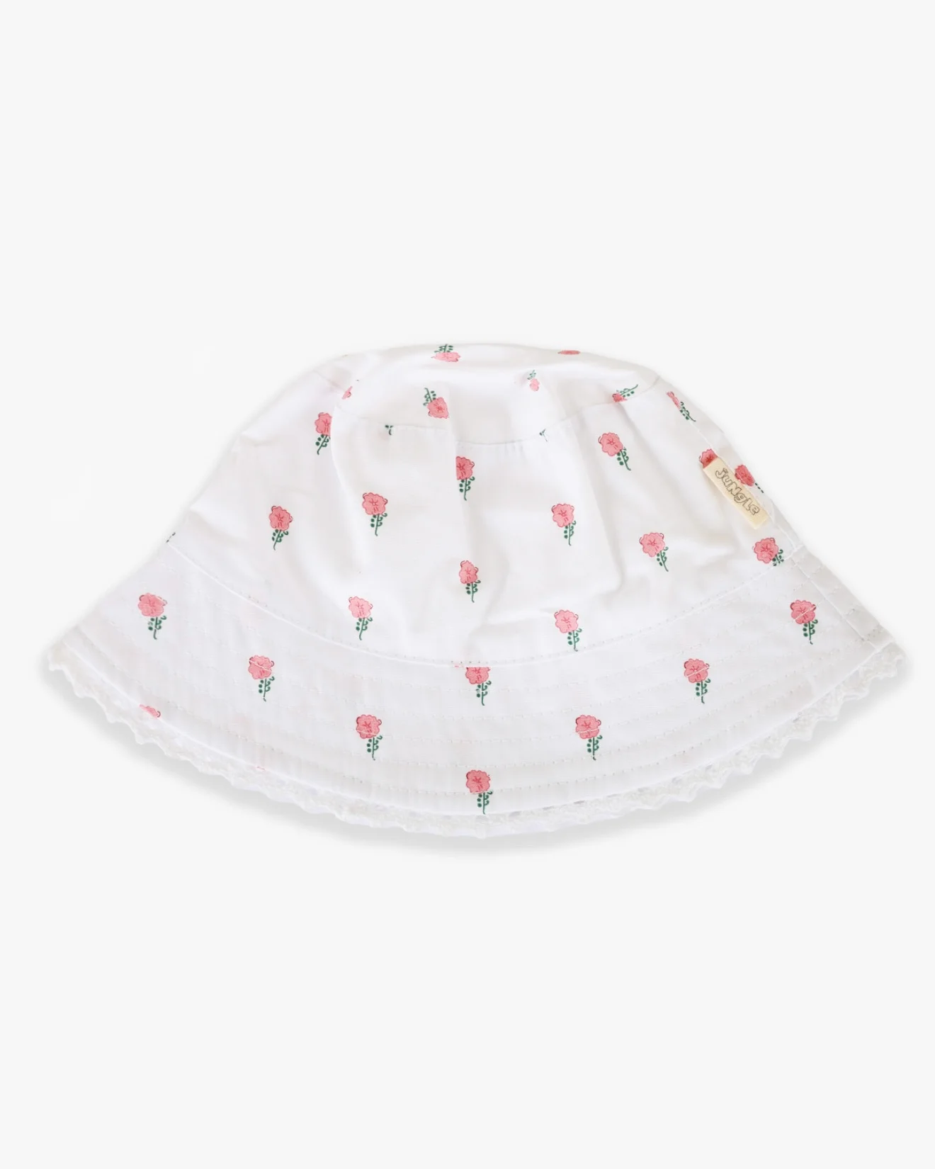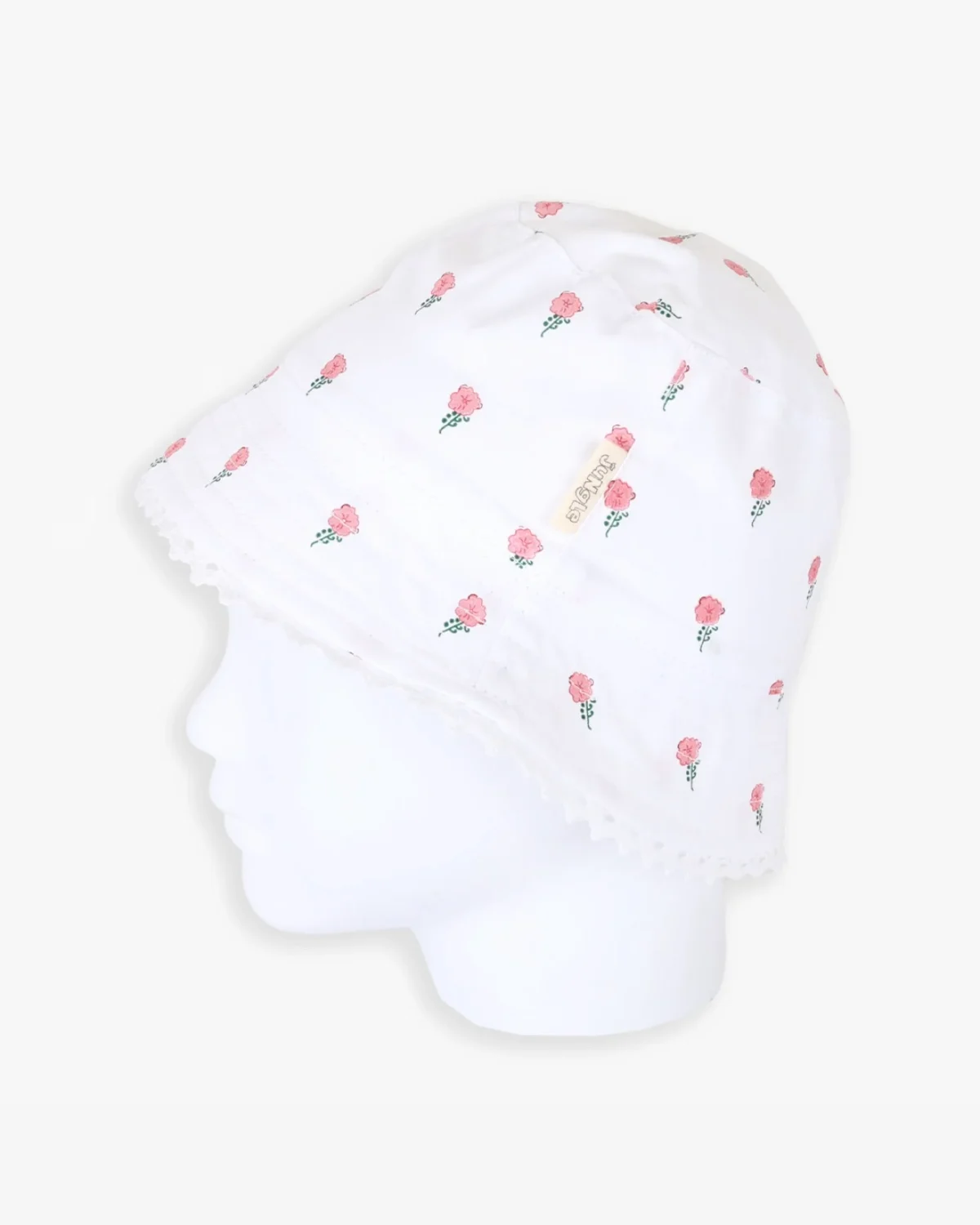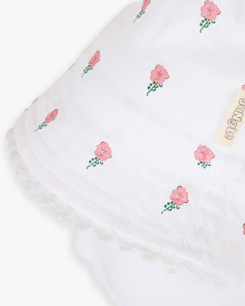 Jungle šeširić za bebe od 100% pamuka, u beloj boji sa roze cvetićima, tu je za sve tople dane i zaštitu od štetnih sunčevih zraka.