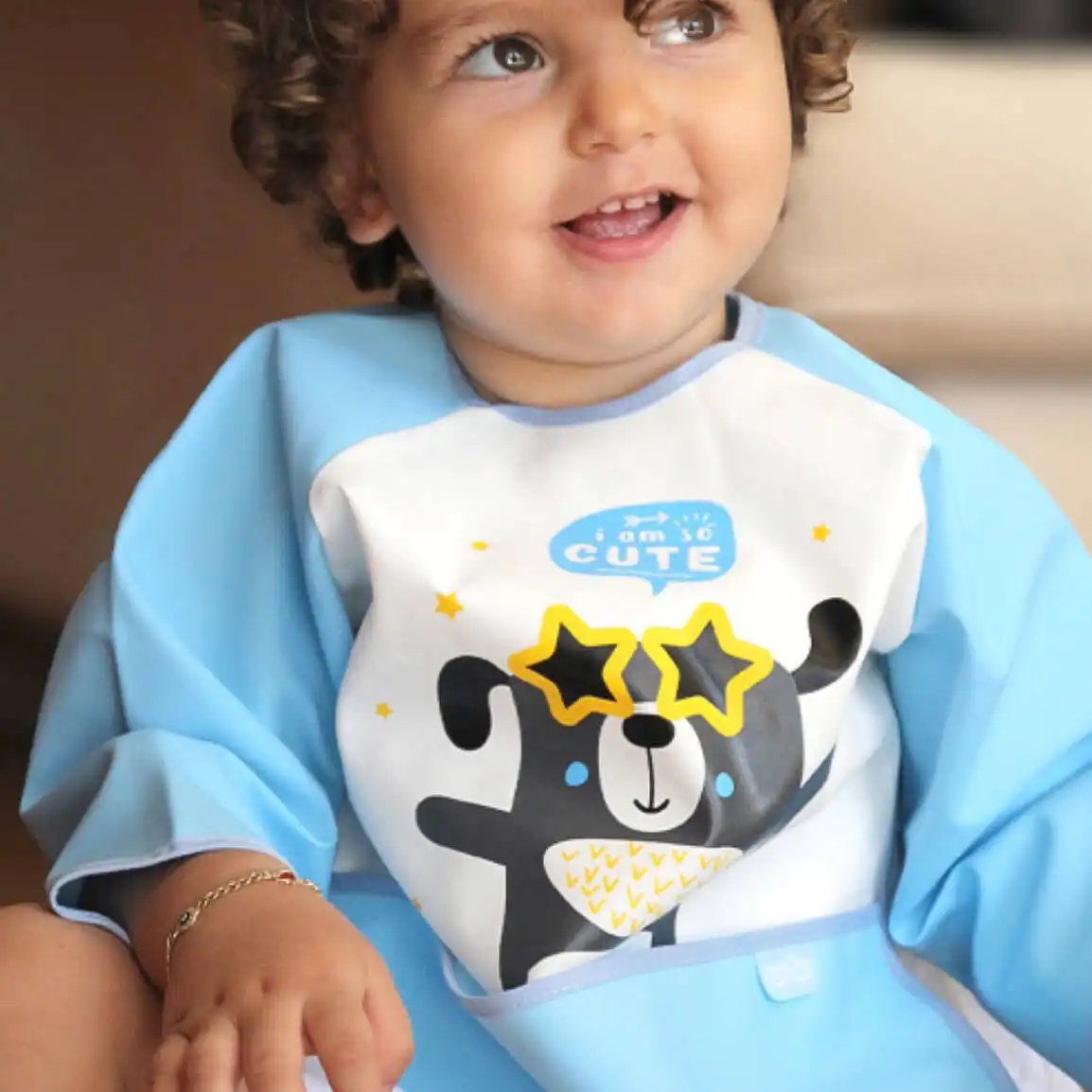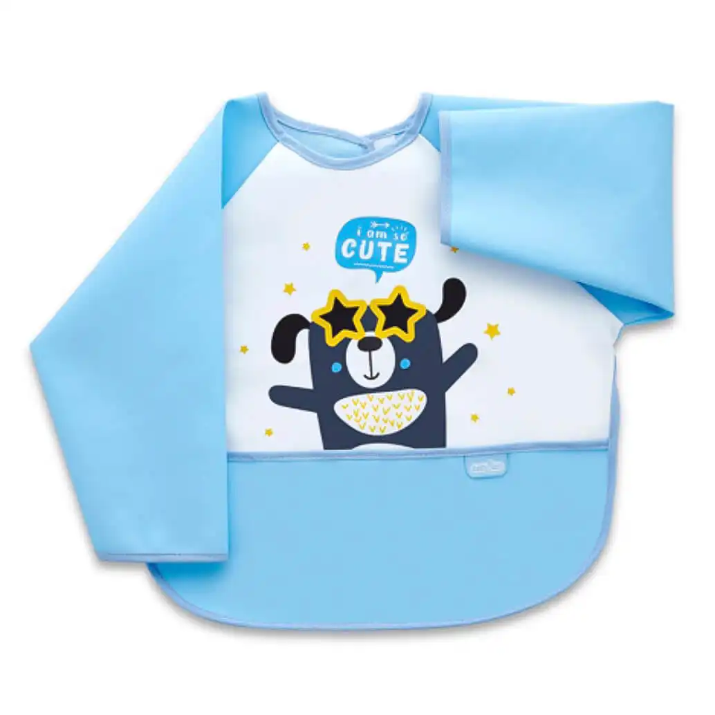 BabyJem plava silikonska portikla sa rukavima, za bebe dečake. Sa slikom kuce, natpisom i džepićem na prednjoj strani.