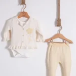 Knit kompletić za bebe devojčice, od najmekšeg 100% pamuka. Sastoji se iz 3 dela i sadrži: džemperić, donji deo i kapicu. Moderan dizajn i udoban kroj čine ga savršenim za svakodnevne aktivnosti, ali i za posebne prilike, fotkanje ili za poklon!