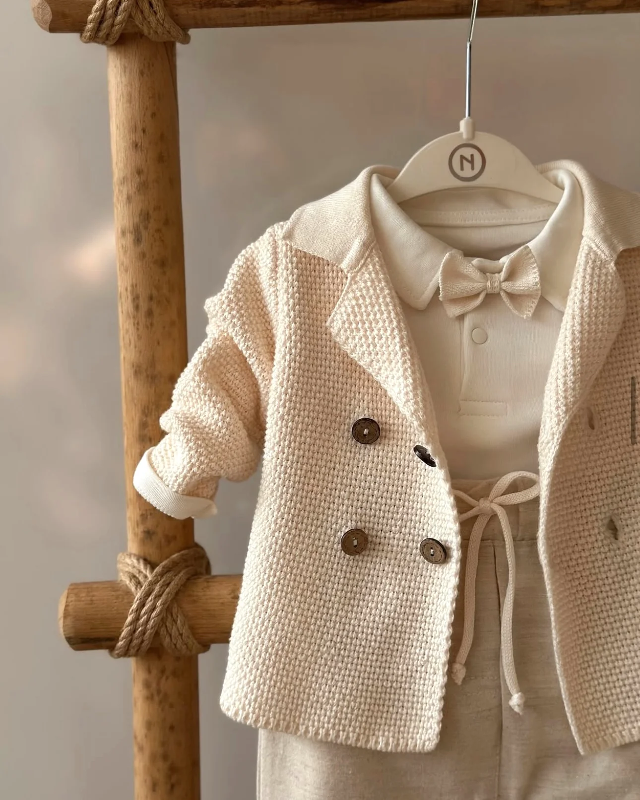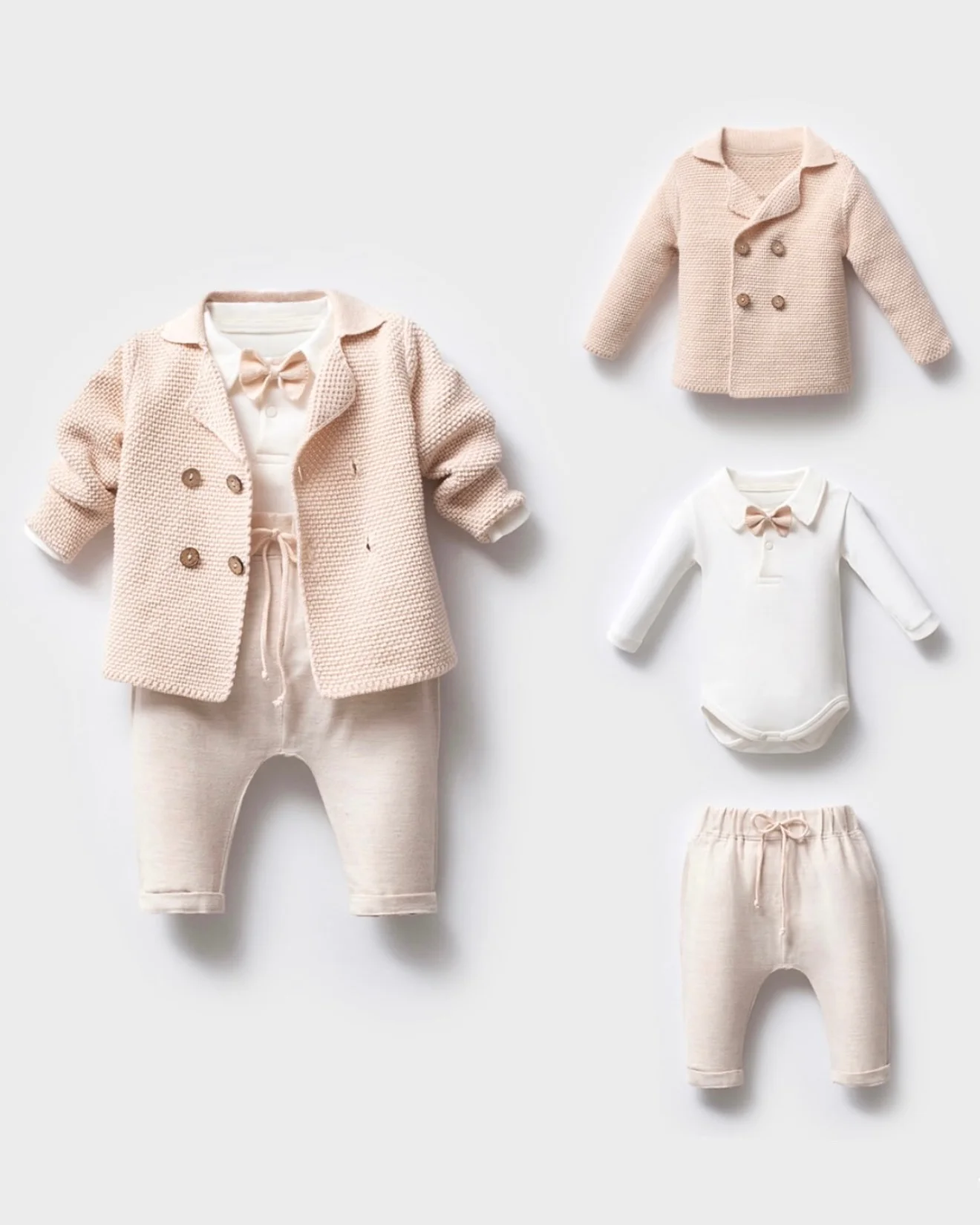 Kompletna odevna kombinacija za posebne prilike, sa džemperićem koji je uklopiv uz sve! Osim džemperića u kompletu se nalaze i lagane tanke pantalone, kao i beli bodi na dug rukav, sa kog možeš skinuti leptir mašnu. Osim što je ceo komplet idealan outfit za svaku posebnu priliku, on sadrži komade koji se mogu odlično kombinovati i pojedinačno, a bebi su udobni pre svega.