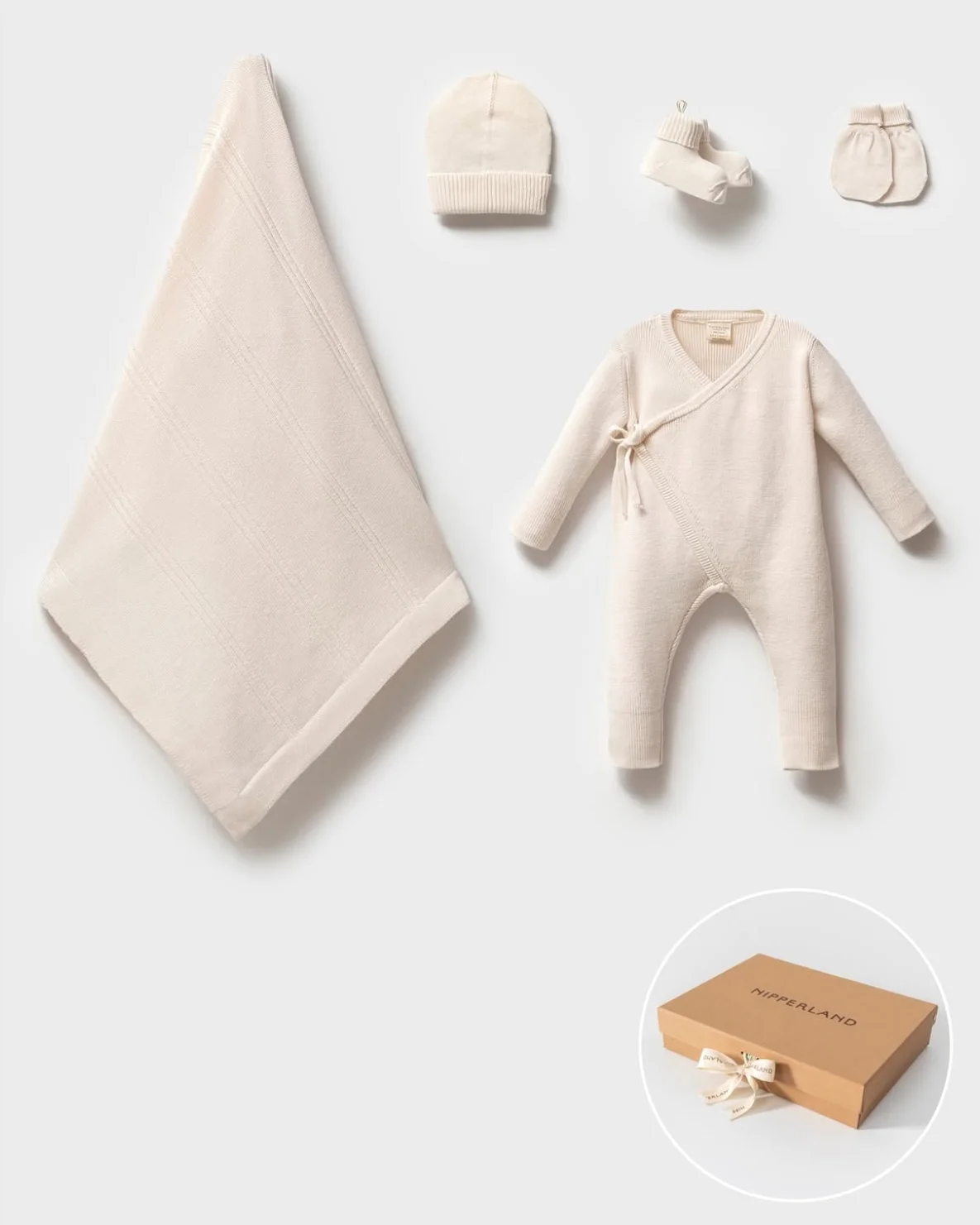 Prvi NipperLand 5/1 set u kutiji, od organskog 100% pamuka i u neutralnoj, krem boji.