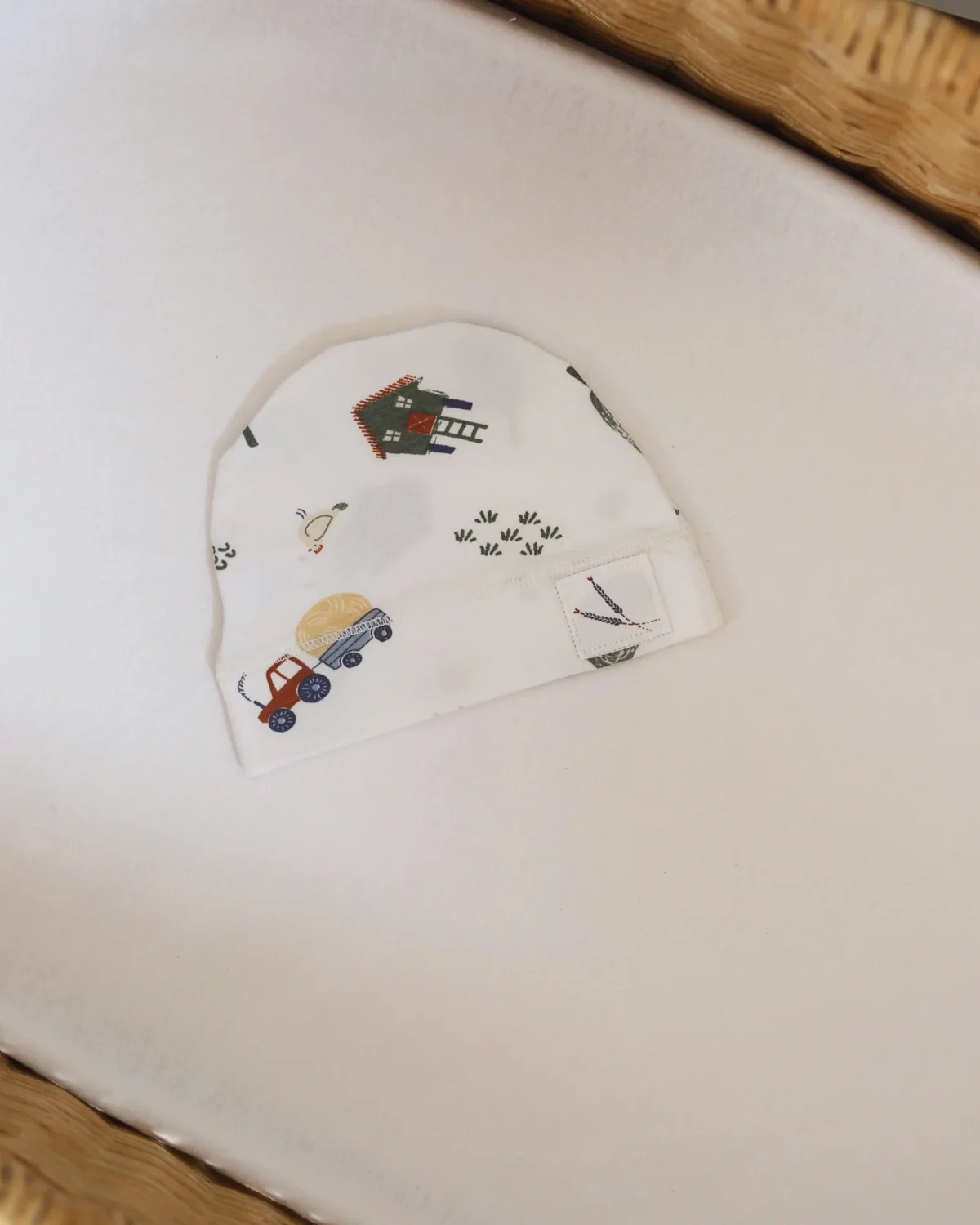 U beloj boji koja se odlično uklapa sa komadima iz MyTinyFarm kolekcije (u istom dezenu), ali naravno i sa ostalim komadima iz bebinog garderobera.