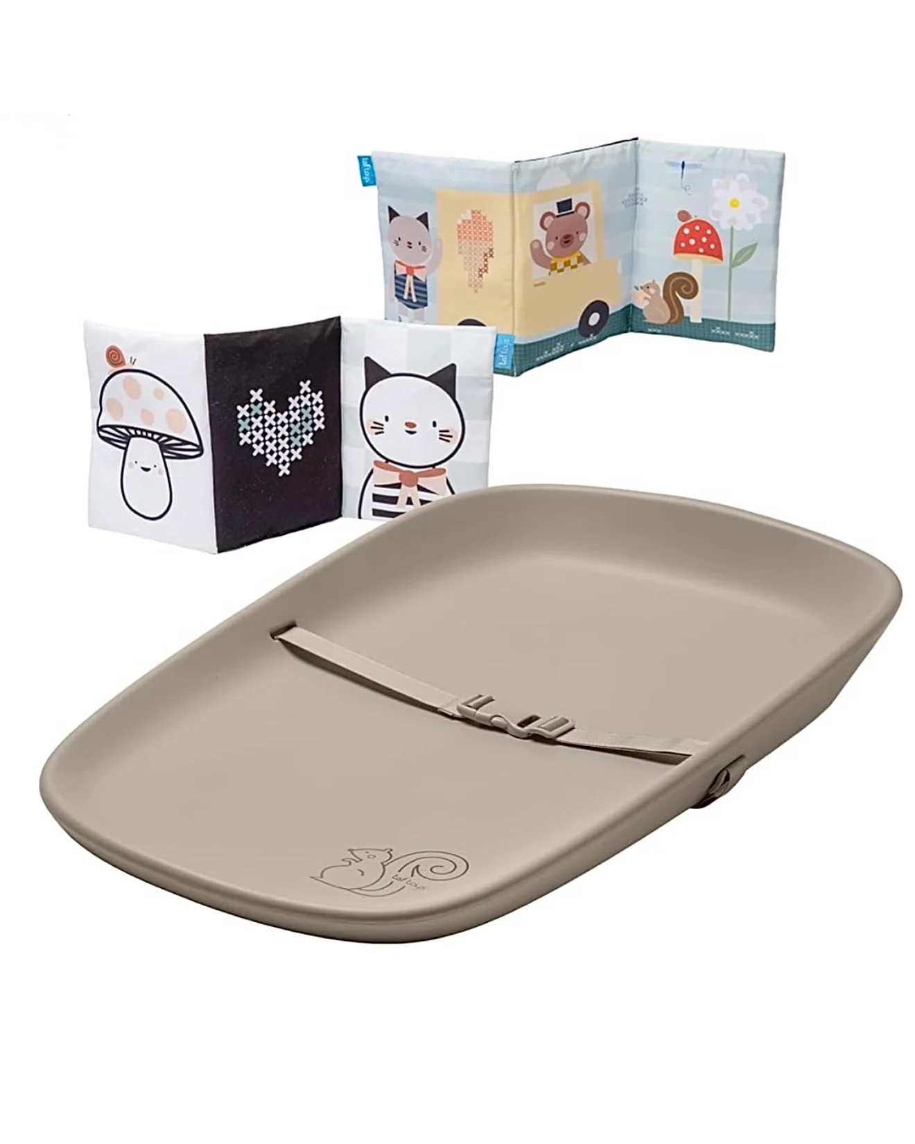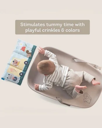 Neutralna, estetična Taf Toys podloga za presvlačenje izrađena je od pene koja je vodootporna i udobna za bebu. U kompletu sa njom nalazi se i dvostrana senzorna knjiga, koja će okupirati bebu dok leži i olakšati nam presvlačenje.