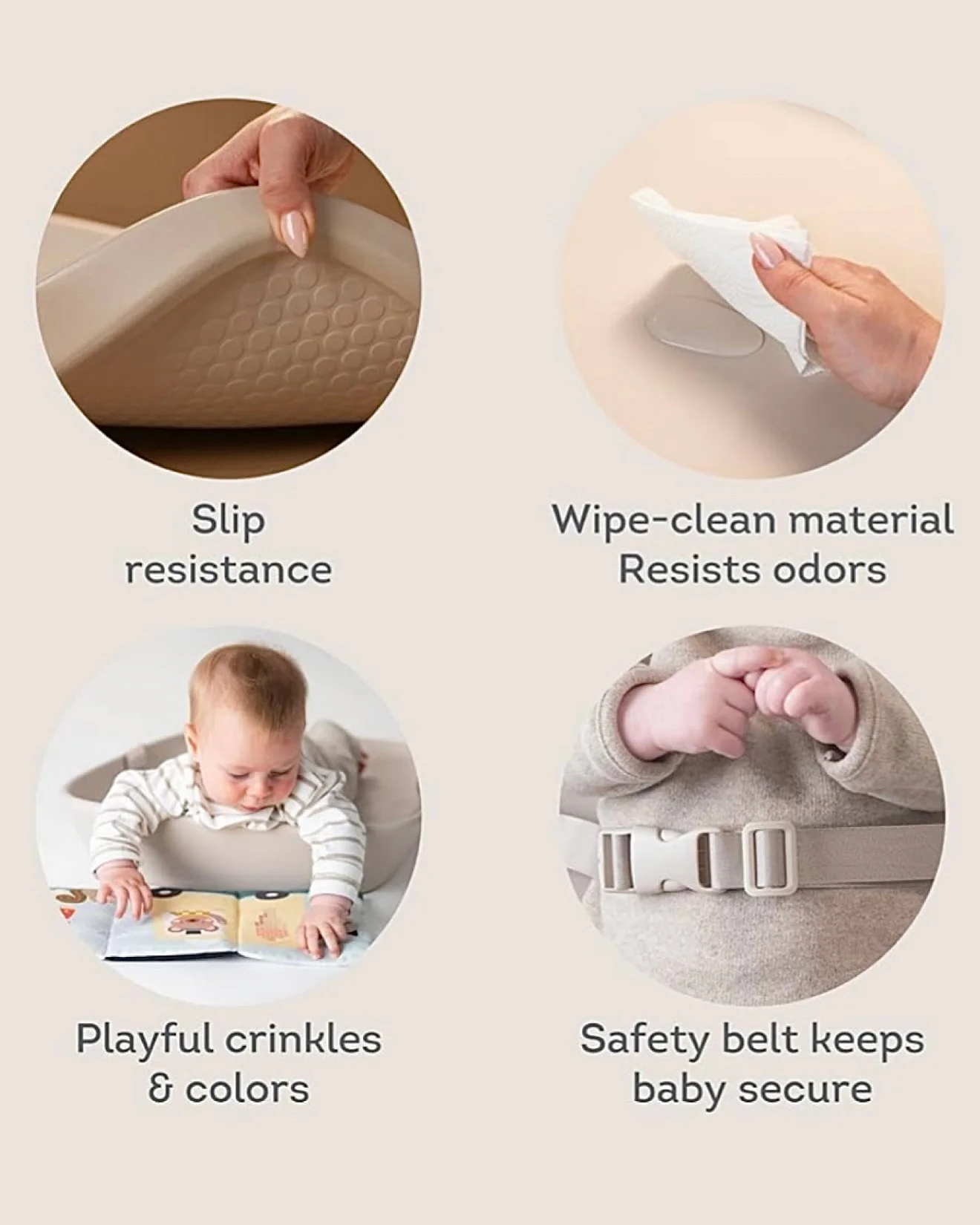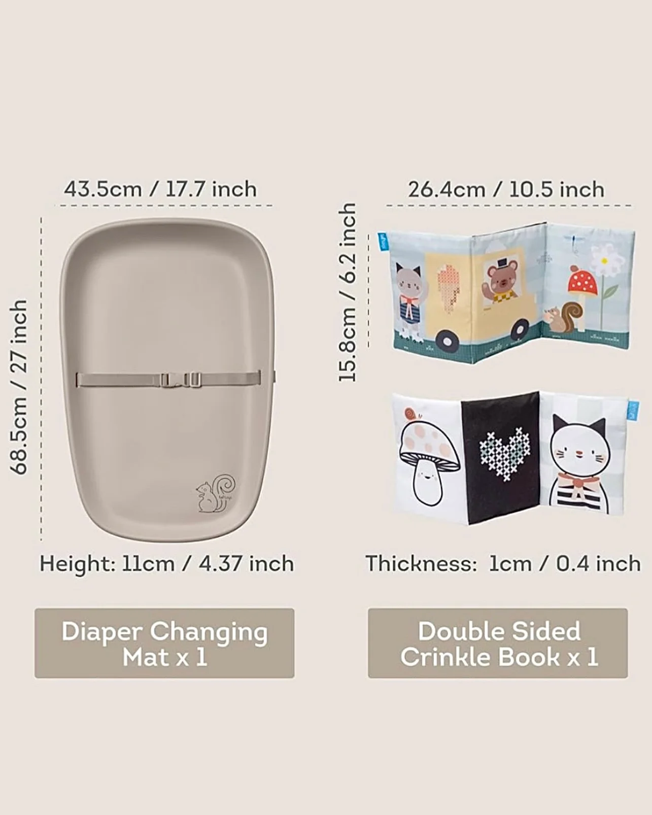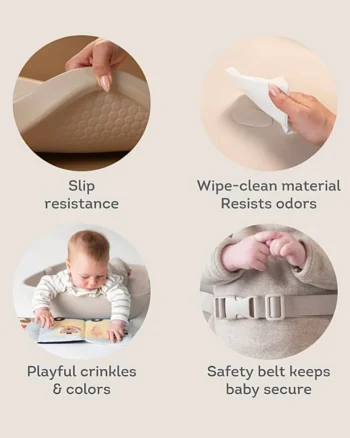 Glatka podloga za presvlačenje od pene, dizajnirana je tako da bude udobna za bebu, sigurna (ima pojas za držanje bebe), ali i vodootporna – vrlo lako se čisti. Uz to, u neutralnoj je boji i odlično se uklapa uz svaku estetičnu sobicu. U kompletu sa podlogom dolazi i senzorna dvostrana knjiga, koja će vreme presvlačenja pelena učiniti lakšim i zabavnijim, a koju beba može gledati i na stomaku (za tummy time) i na leđima.