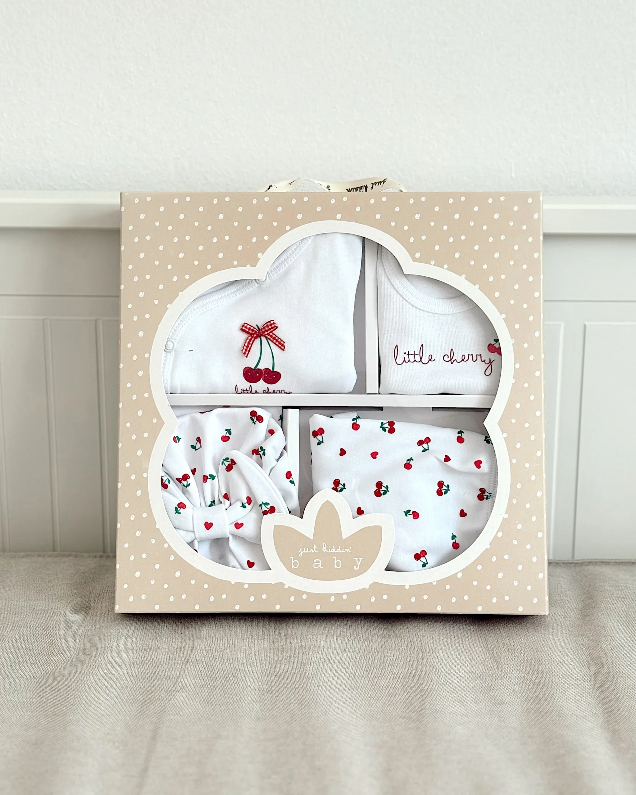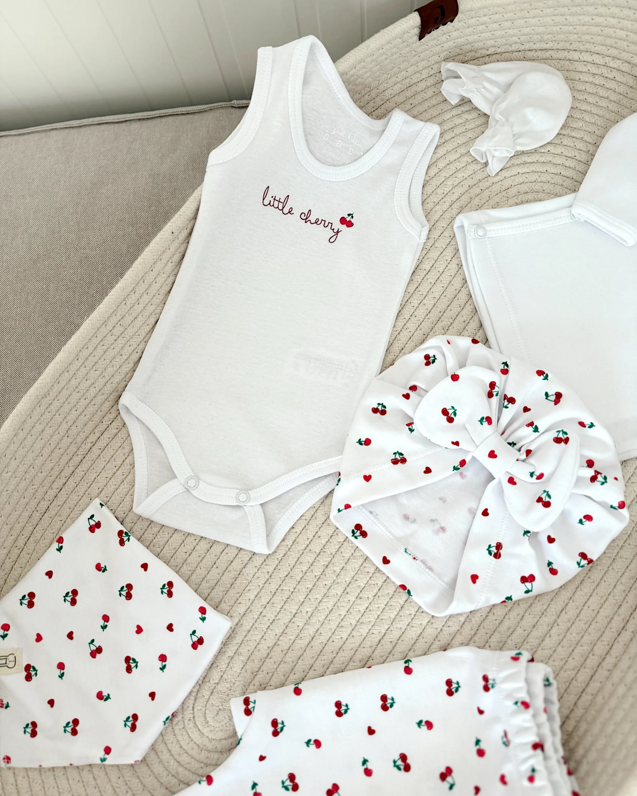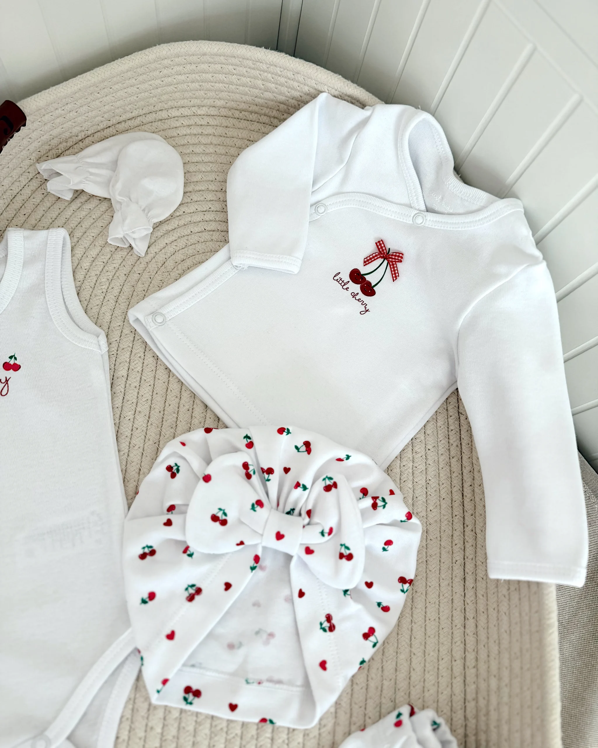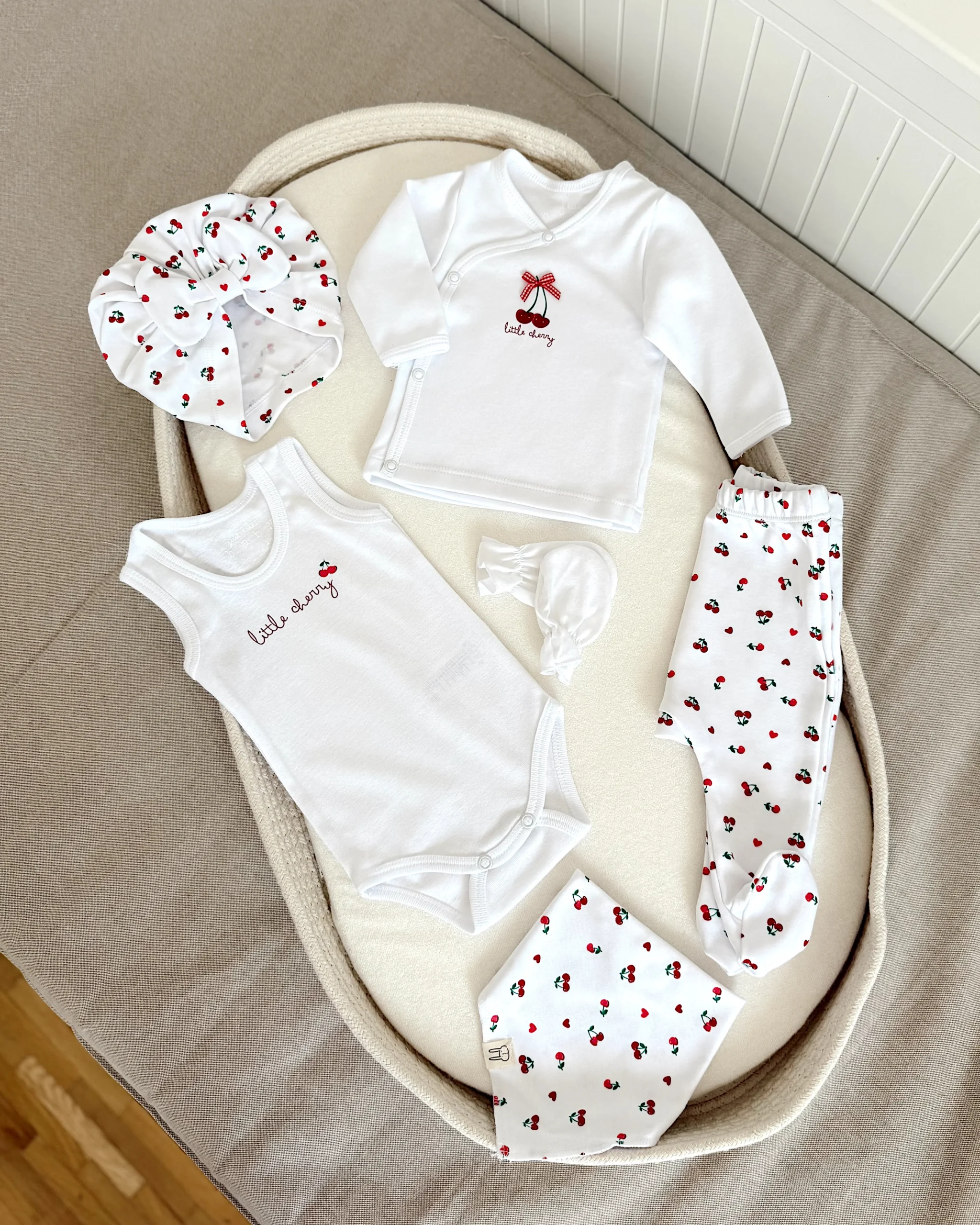Just Kiddin’ Cherry 6/1 set, izrađen je od 100% pamuka i vrlo je praktičan za prvi period sa bebom!