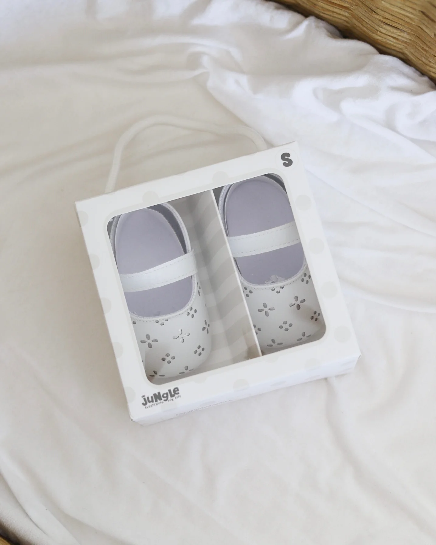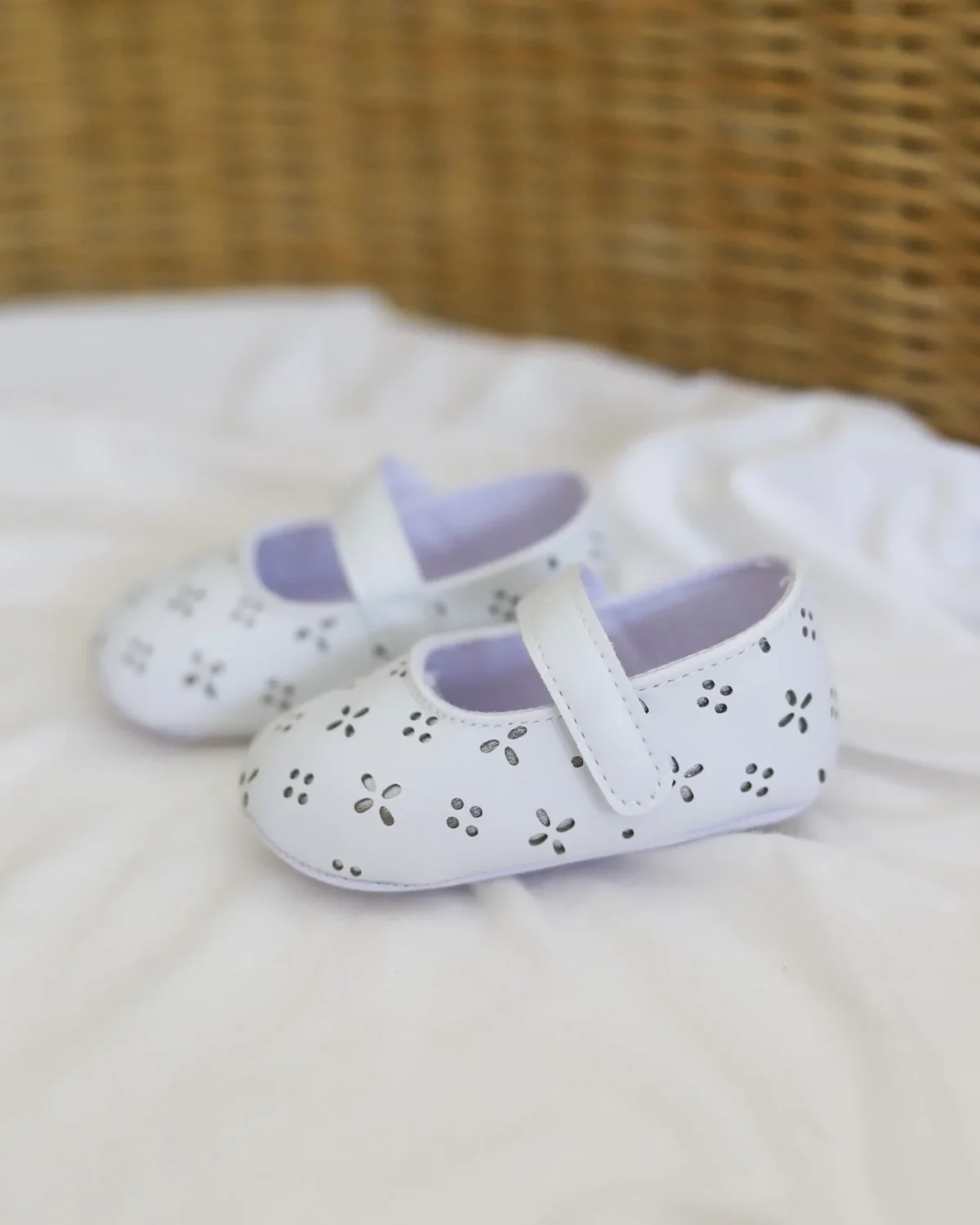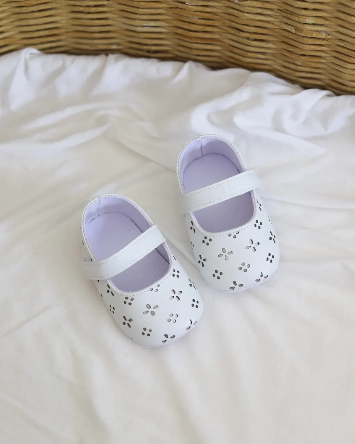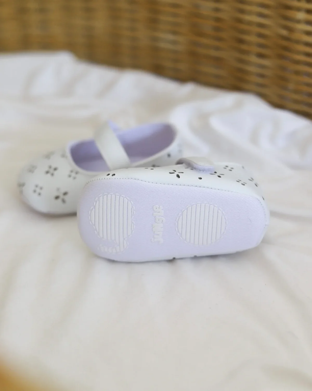 Bele nehodajuće baletanke, sa rupičastim detaljima i srebrnom postavom ispod njih, sjajne su za kombinovanje uz razne haljinice! Kopčaju se pomoću kaiša sa čičkom, a imaju đon koji je mekan, potpuno savitljiv i ne opterećuje bebina stopala.