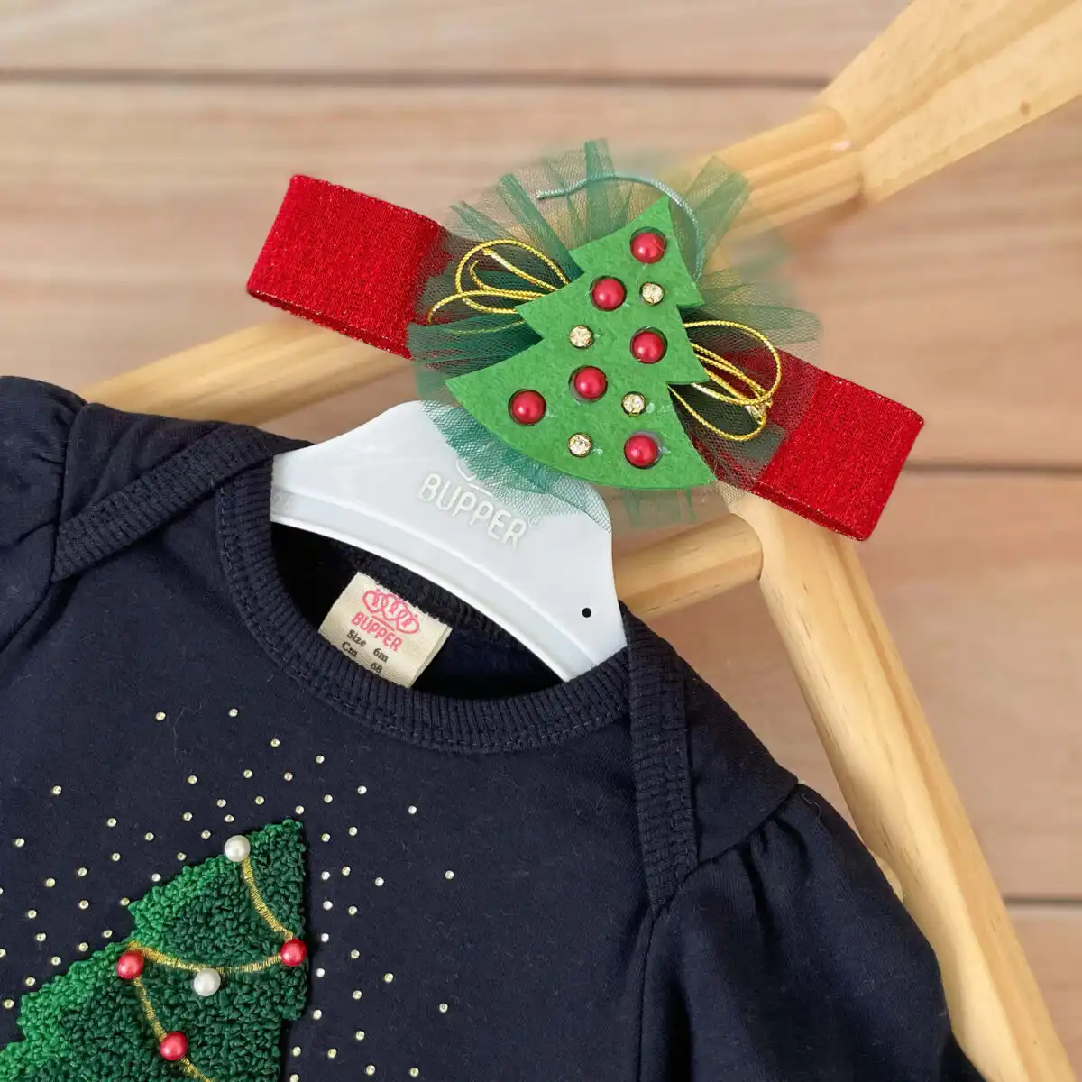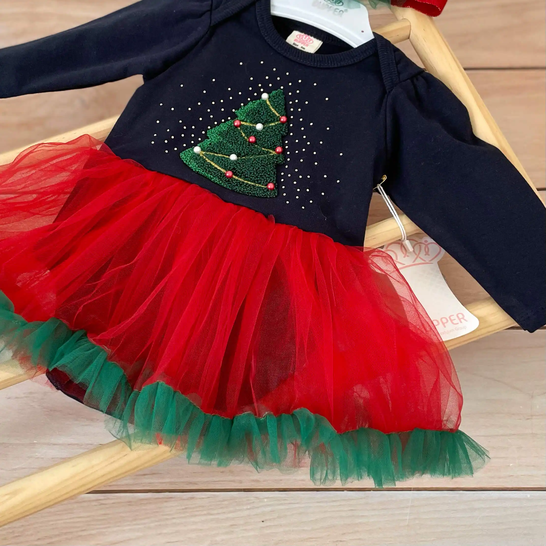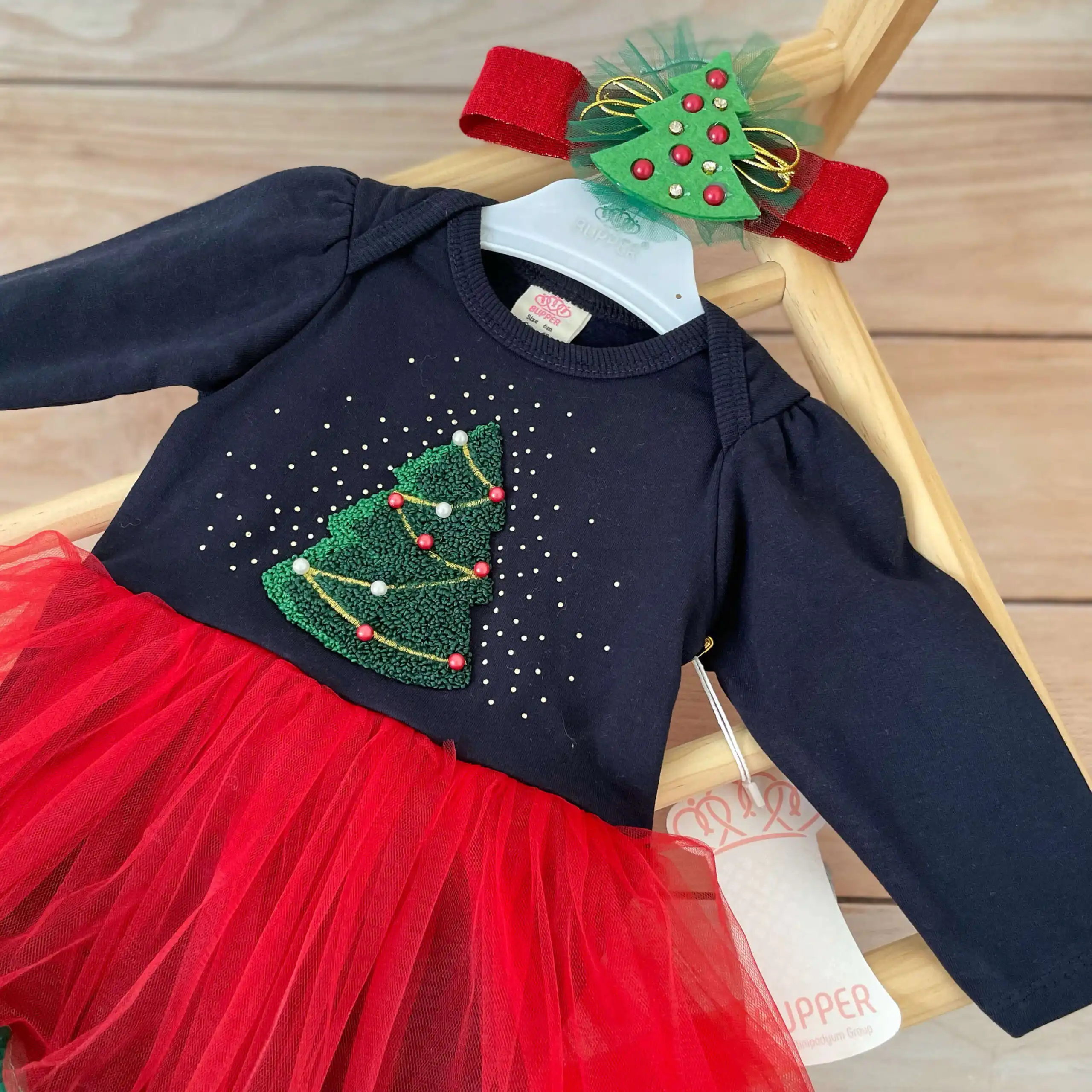 Kompletić za najslađe novogodišnje fotke, organizovano slikanje i sve prilike tokom praznika! Sadrži bodi-haljinicu i traku za kosu. Bodić je futrovan iznutra, mekan i vrlo topao. Sa jelkicom i 3D bisernim ukrasima na sredini. U kombinaciji teget, crvene i zelene boje.