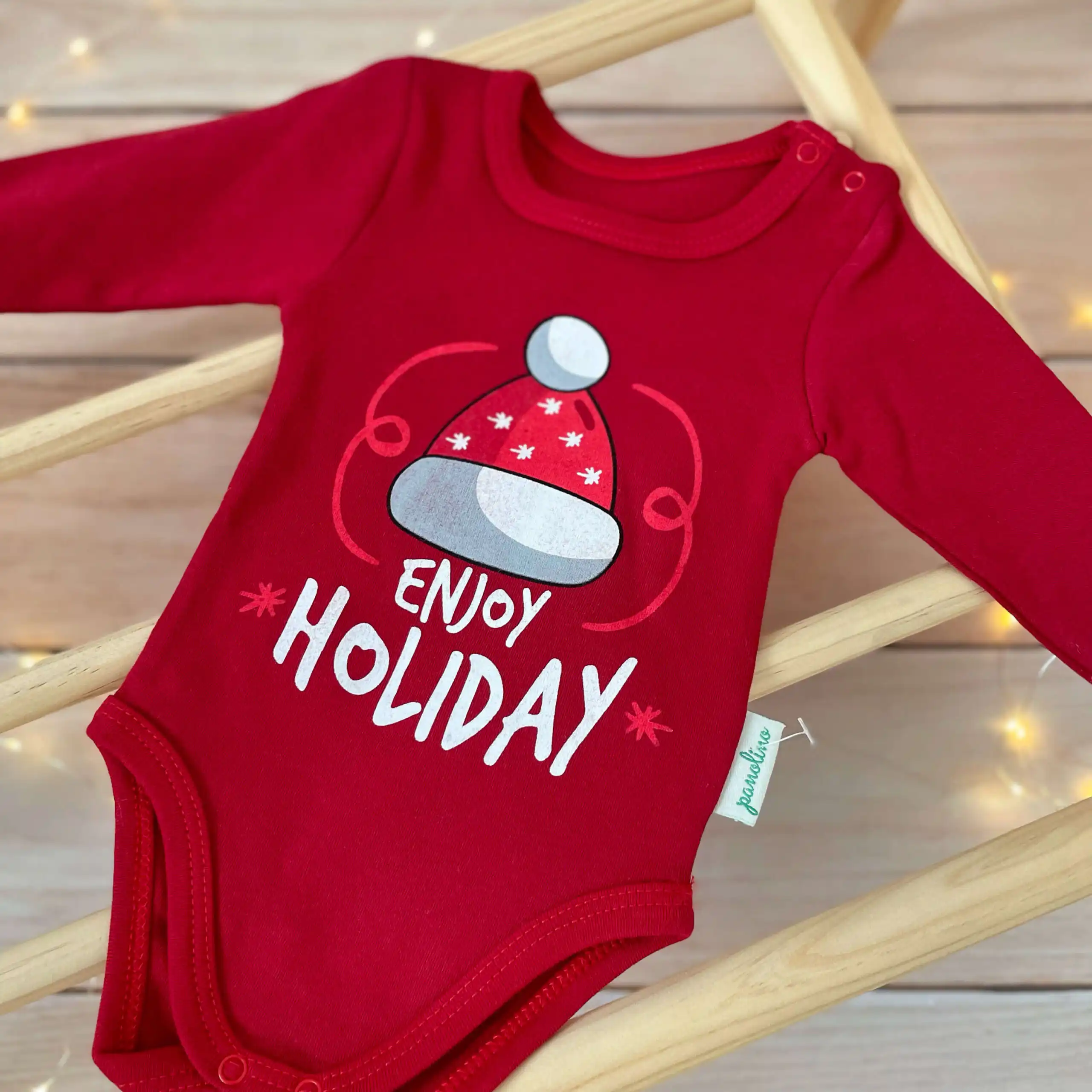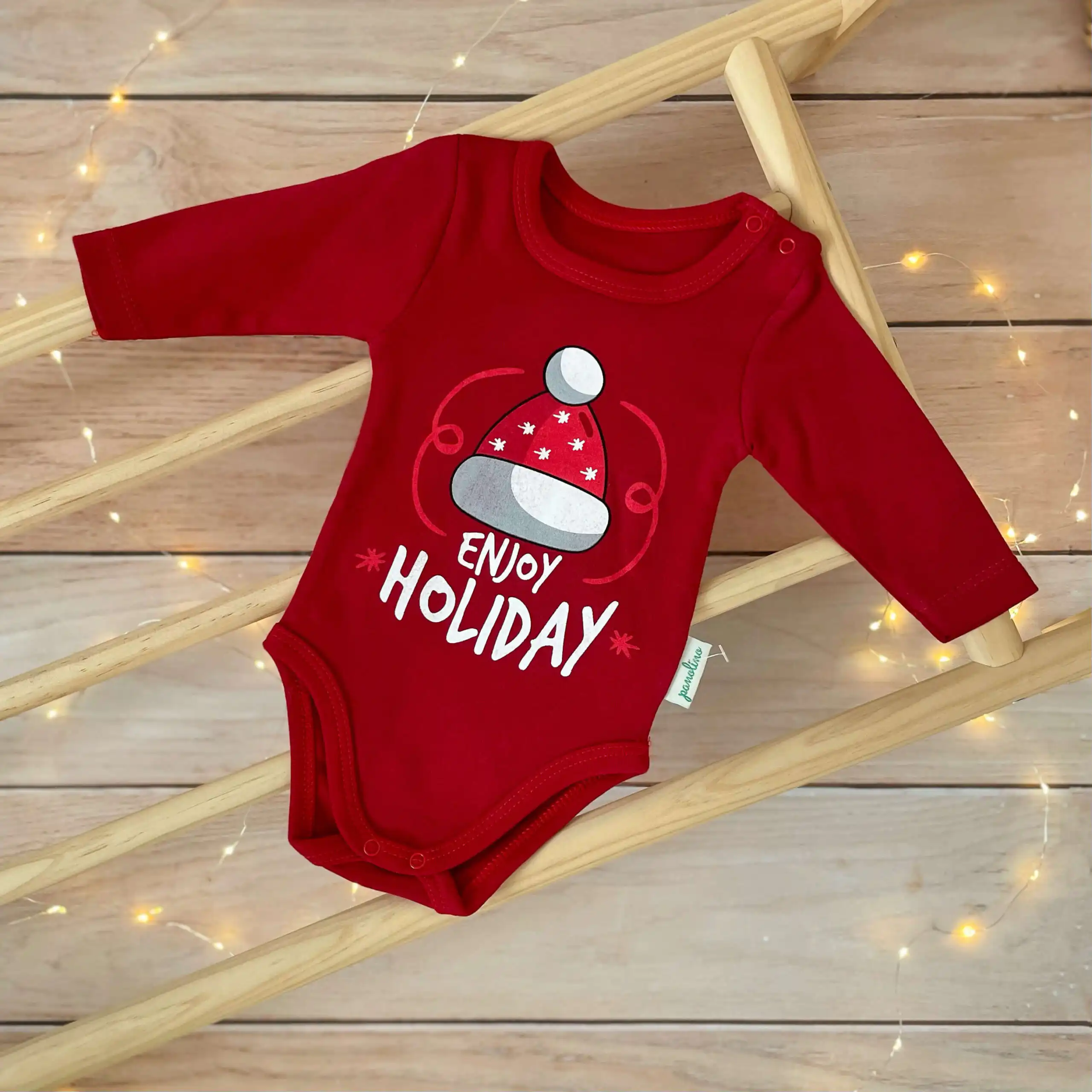 Pamučni novogodišnji bodić na duge rukave, u crvenoj boji, sa natpisom „Enjoy Holiday“.