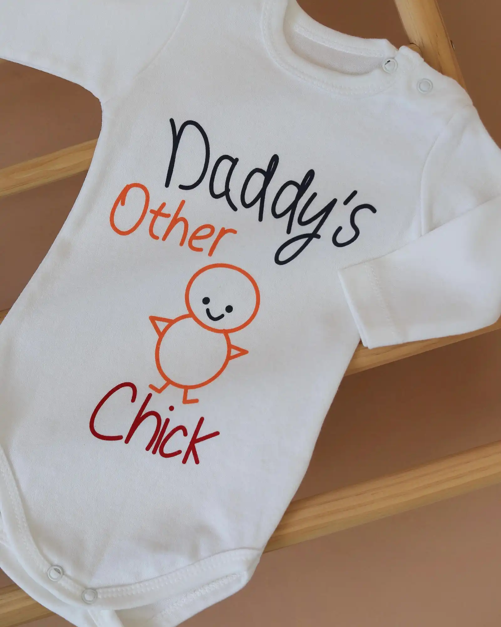 Pamučni beli bodić na duge rukave, sa natpisom „Daddy’s other Chick“. Raskopčava se na drikere između nogica i oko vrata. Izrađen od mekog 100% pamuka!