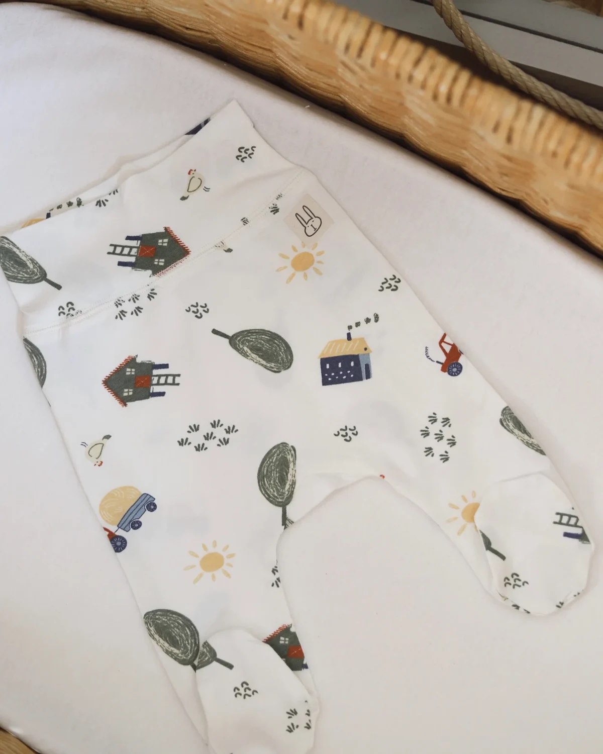 Donji deo sa stopicama vrlo je praktičan za brzo spremanje, ali i za bebe koje stalno izuvaju čarapice! Uz njega, nogice su potpuno zatvorene i ušuškane. Ima i široki lastiš koji odlično drži, a ne steže dete. Možeš ga podići tako da pantalonice budu dublje, ili preklopiti. Odlično se kombinuje sa bodićima, portiklama i ostalim komadima iz MyTinyFarm kolekcije, u istom ovom dezenu.