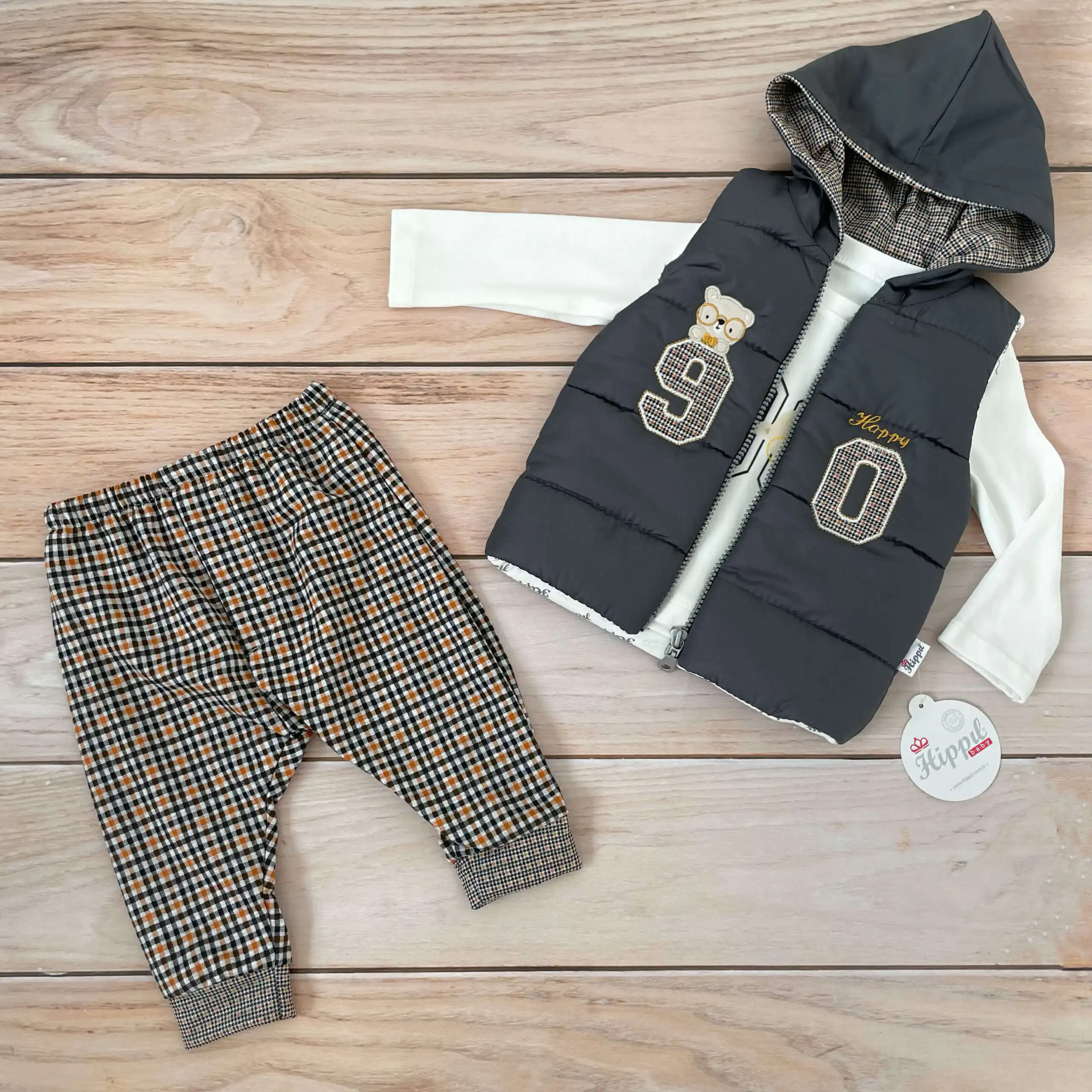Kompletić sa šuškavim prslukom „Meda 90“. U kombinaciji sive, braonkaste i bele boje, sa oker detaljima.