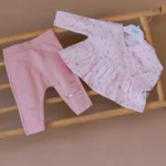 Bluzica na tufnice i helankice od nežnog 100% pamuka! Kompletić modernog dizajna, idealan za sve aktivnosti tokom dana. Pruža udobnost, nežnost i slobodu pokreta.
