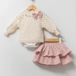 Ako tražiš poseban outfit za bebu devojčicu, onda je NipperLand kompletić sa suknjicom pravi izbor! Sjajan za dane kada želiš da je beba lepo stilizovana, za neke posebne prilike, ili za najslađe fotografije. Namenjen za sezonu proleće/leto, ali ga možeš kombinovati i u hladnijim danima, uz hulahopke i neki dugi bodić. Sastoji se iz tri dela i sadrži: pamučni atlet bodi, končani džemperić i suknju od muslina.