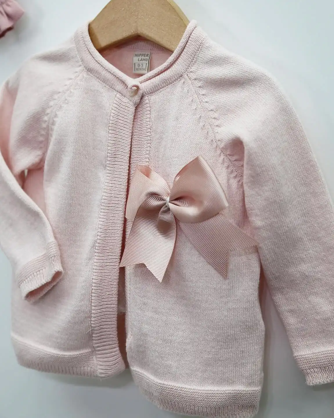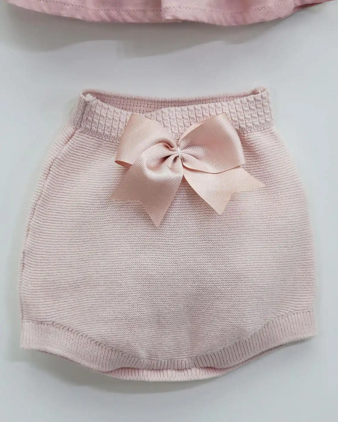 Knit kompletić sa mašnicama NipperLand, u roze boji. Sadrži džemperić, šorts i bluzicu.