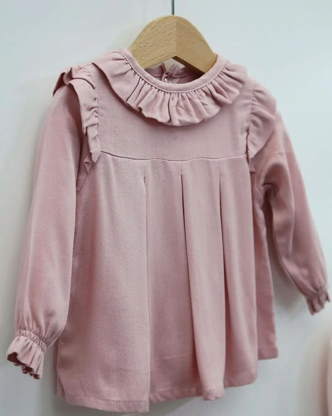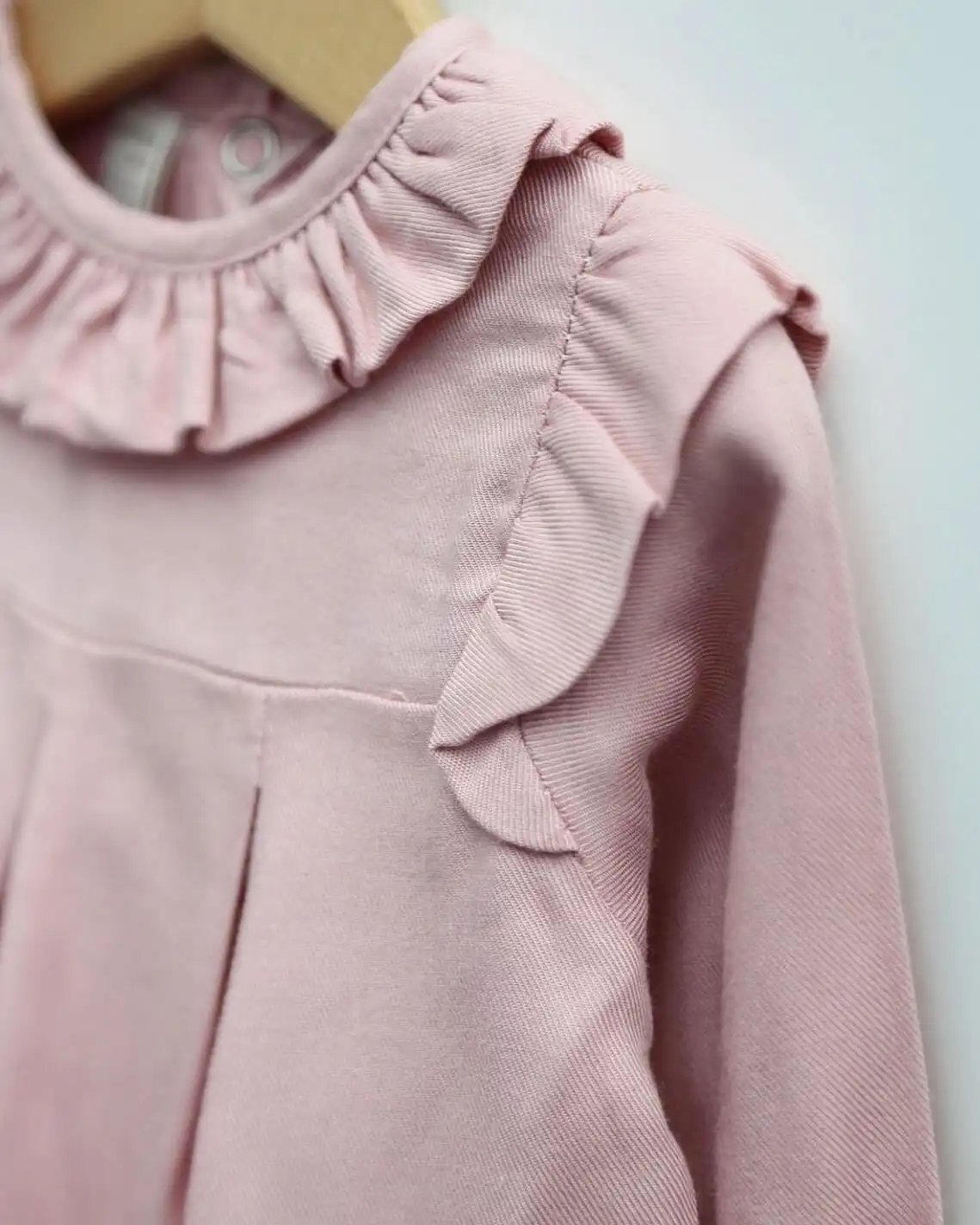 Džemper i šorts su u svetlo roze nijansi. Ispod džemperića nalazi se bluzica sa karnerima, u tamnijoj roze nijansi.