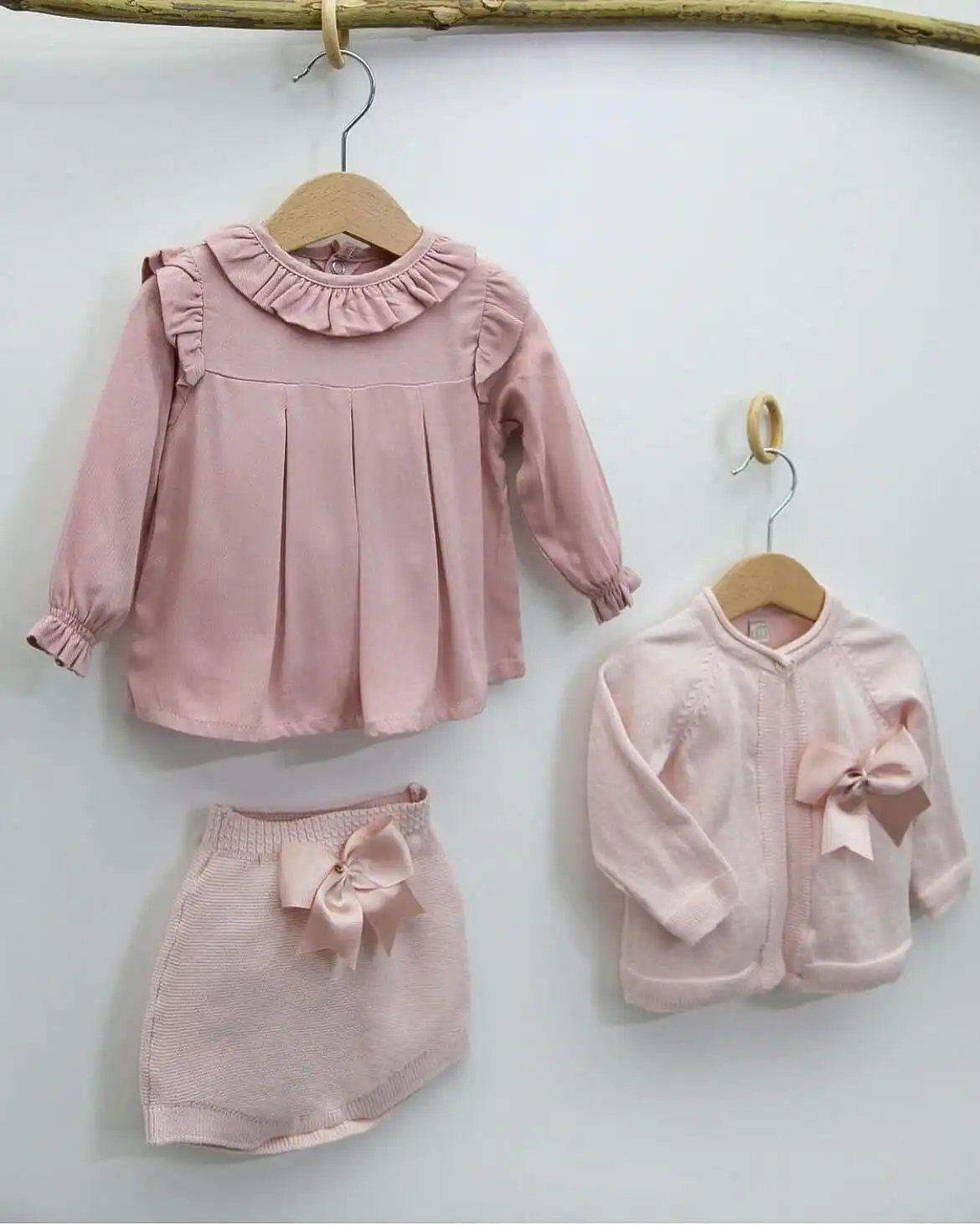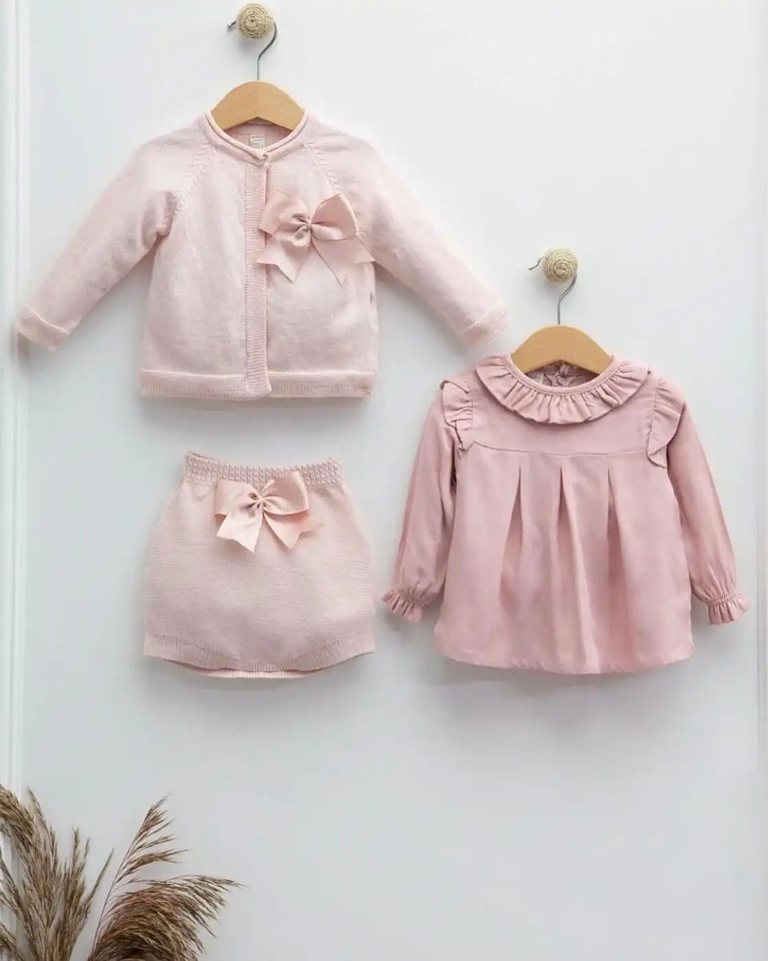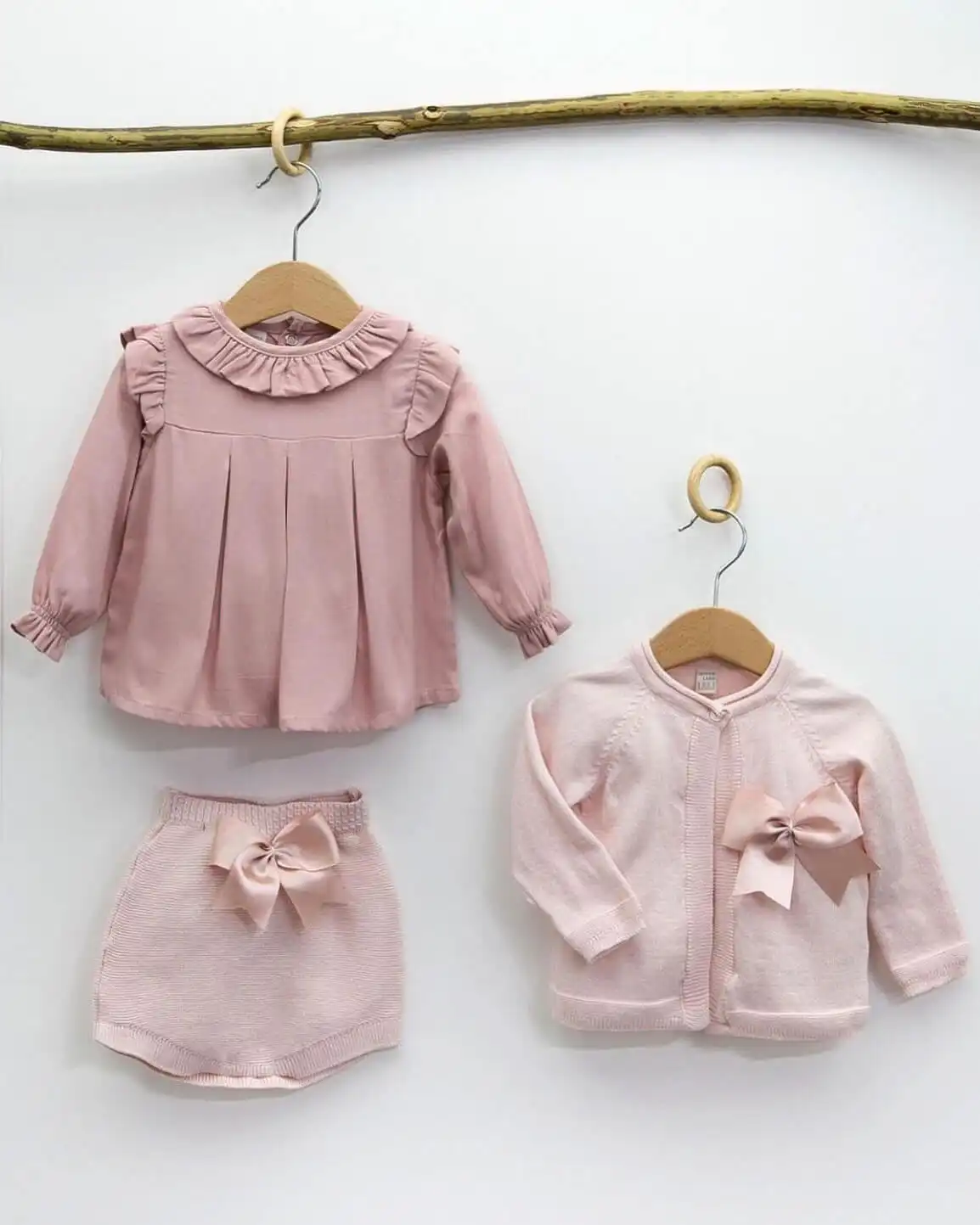 Trodelni knit kompletić za prolećne dane. Sadrži knit džemperić, knit šorts i pamučnu bluzicu sa karnerima. Šorts se raskopčava na dugmiće, između nogica. Ovaj komplet je u roze boji, sa mašnicama.