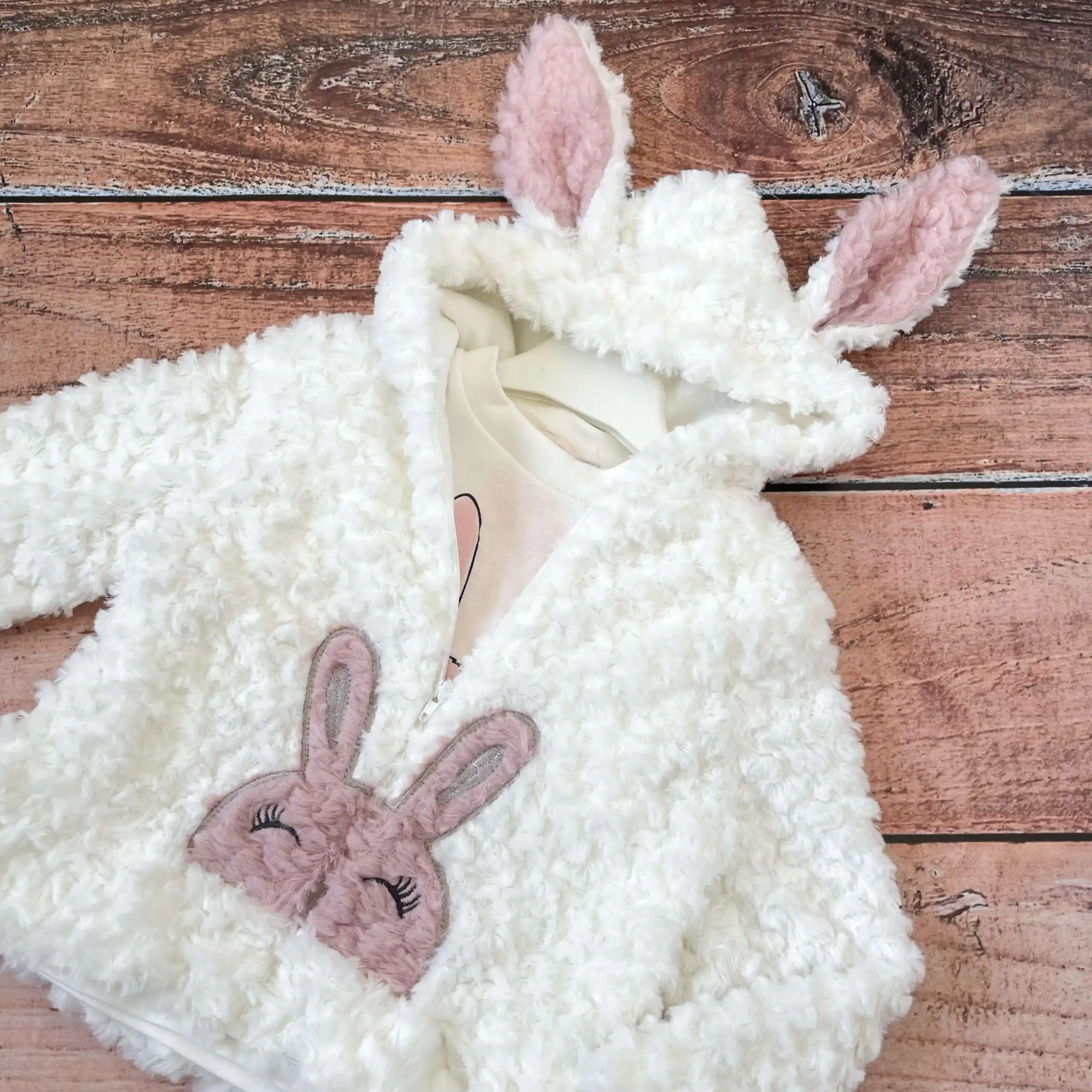 Sadrži mekanu „čupavu“ bundicu sa zekom na središnjem delu i zekinim ušima na kapuljači.