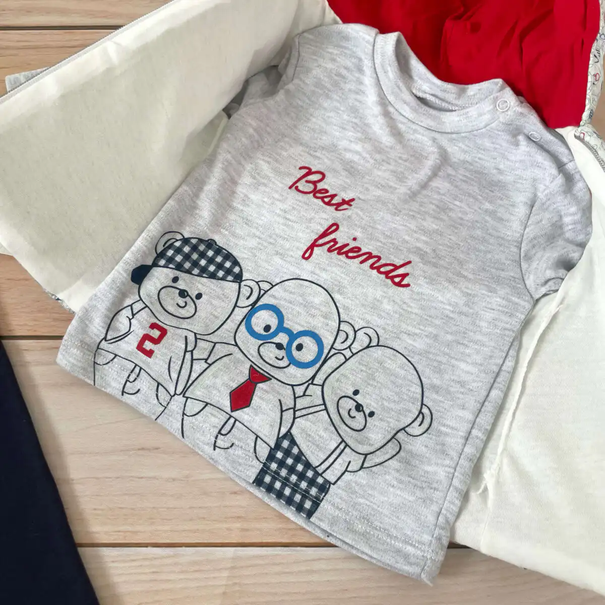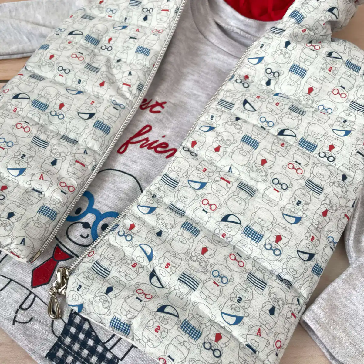 Bluzica na duge rukave u sivoj boji, sa printom 3 mede i natpisom „Best Friends“. Raskopčava se na dva drikera oko vrata.