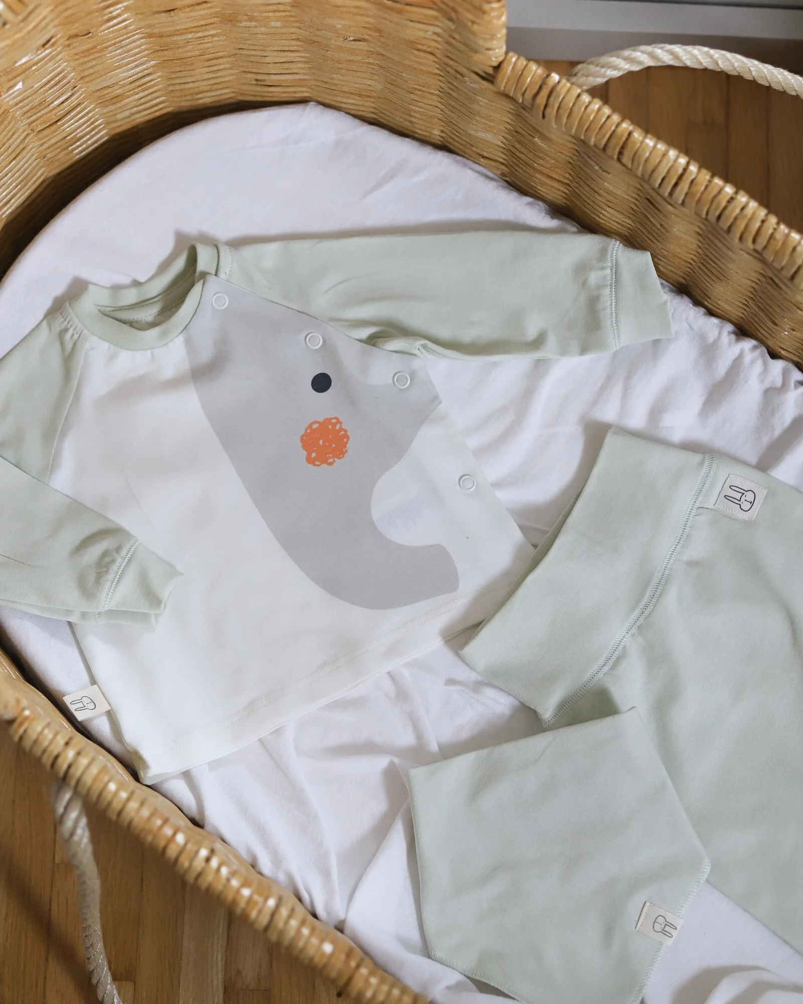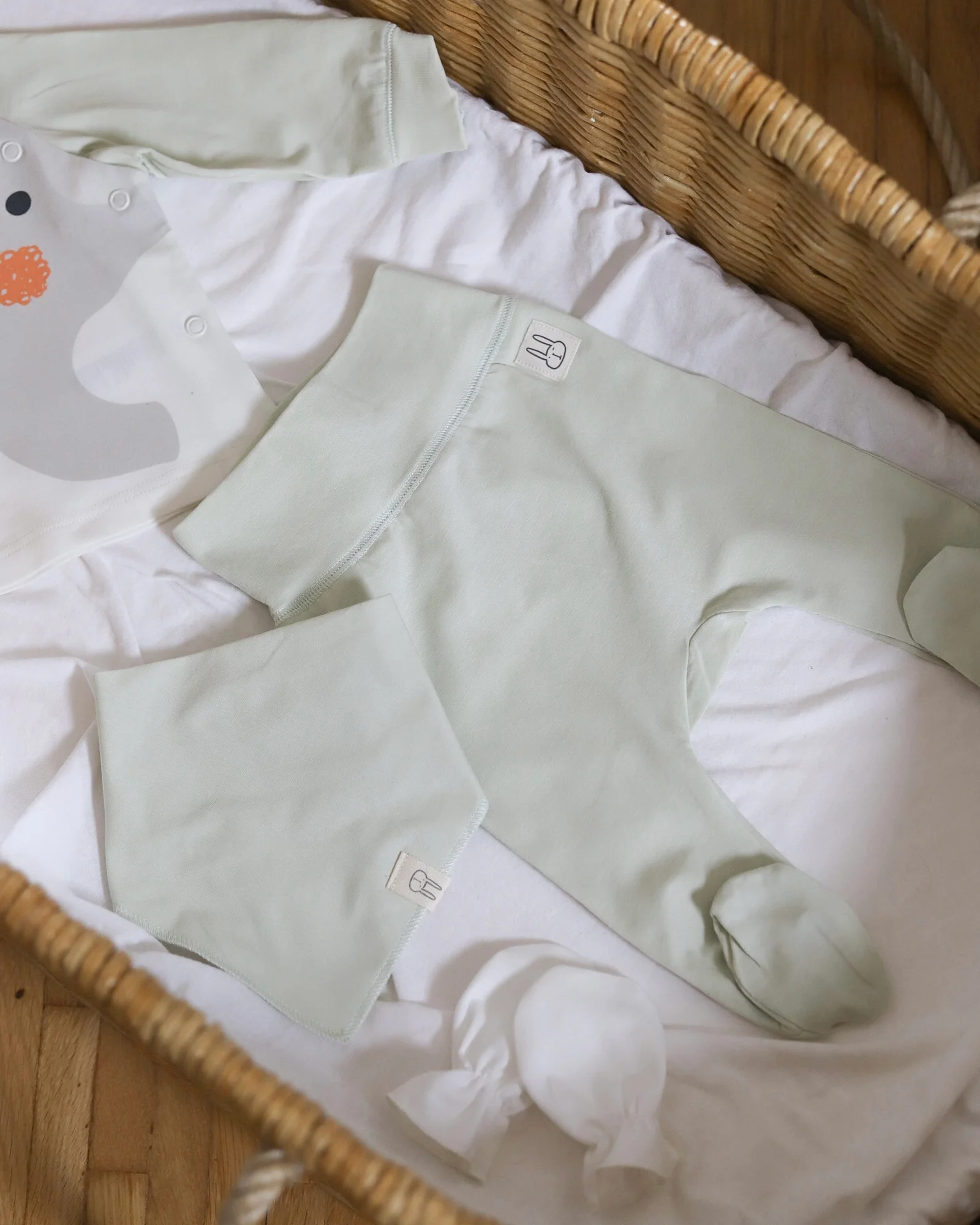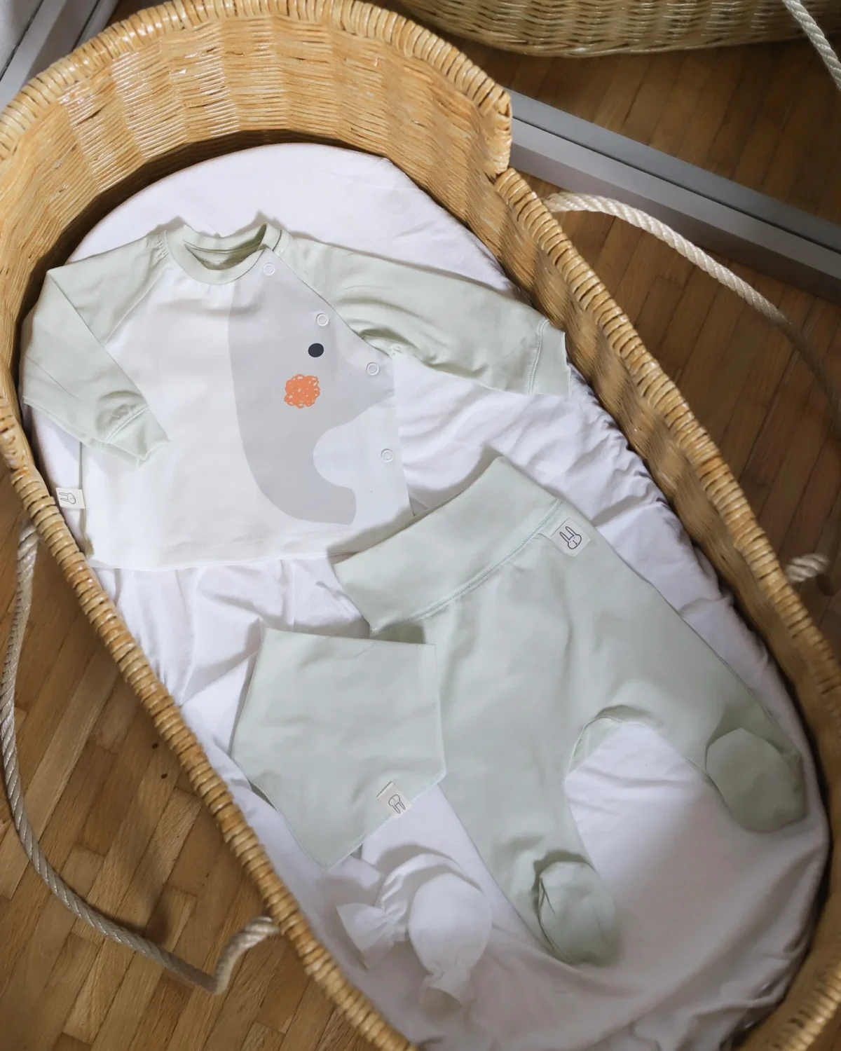 Osnovni komadi za iznošenje bebe iz porodilišta i prvi period po dolasku kući, u jednom setu. Ovaj JK set sadrži benkicu, donji deo sa stopicama, portiklu i rukavice u nežnoj mint nijansi, sa visokim procentom pamuka. Idealan je izbor za proleće i prelazni period.