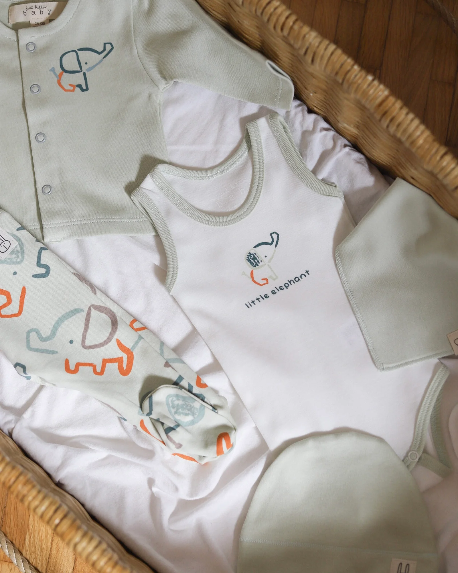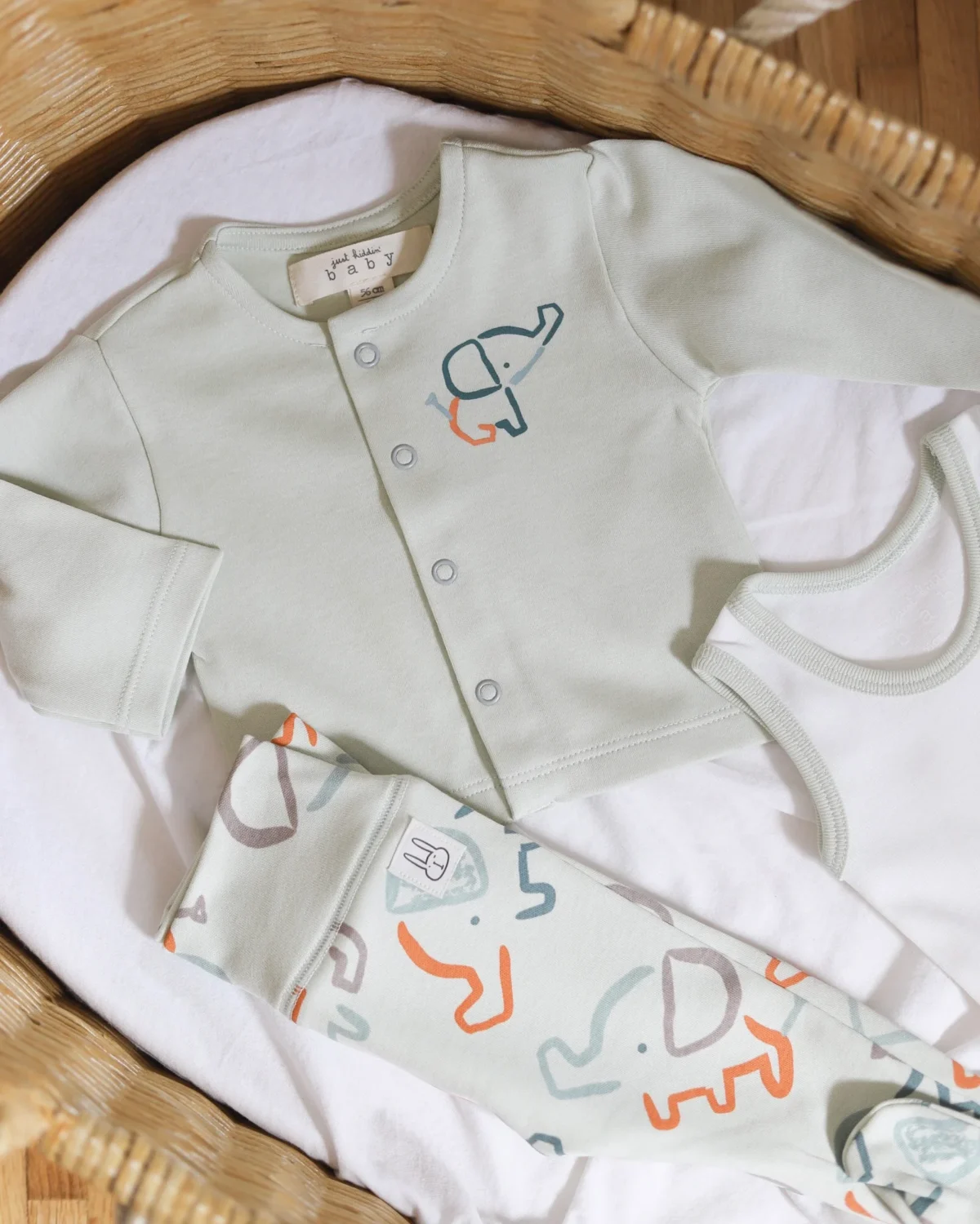 Just Kiddin’ 6/1 JungleFamily set, u mint nijansi, izrađen je od 100% pamuka i vrlo je praktičan za prvi period sa bebom!