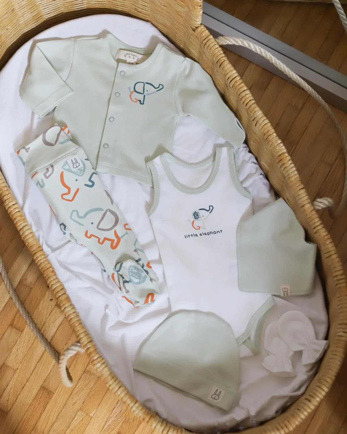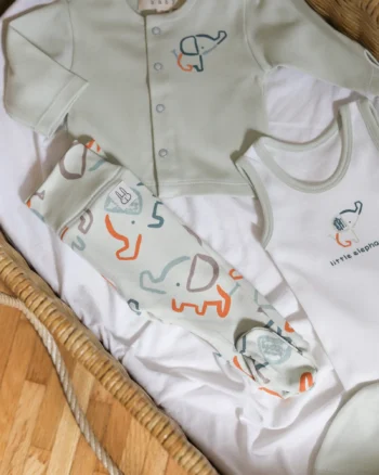 Novi set za dečake, u nežnoj mint nijansi, sjajan je za iznošenje iz porodilišta i prvi period sa bebom, jer sadrži sve potrebne komade u jednoj kutiji! Izrađen od 100% pamuka.