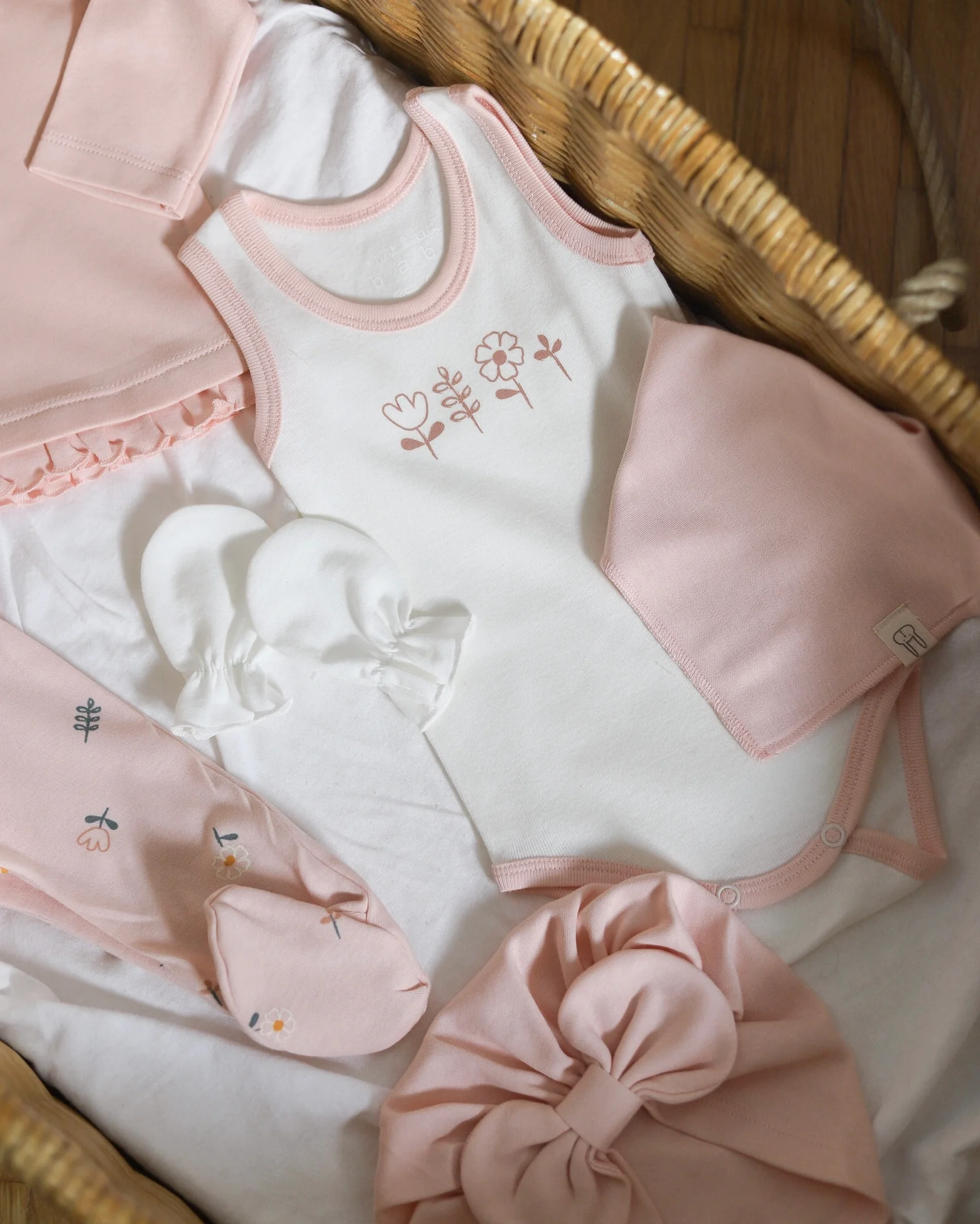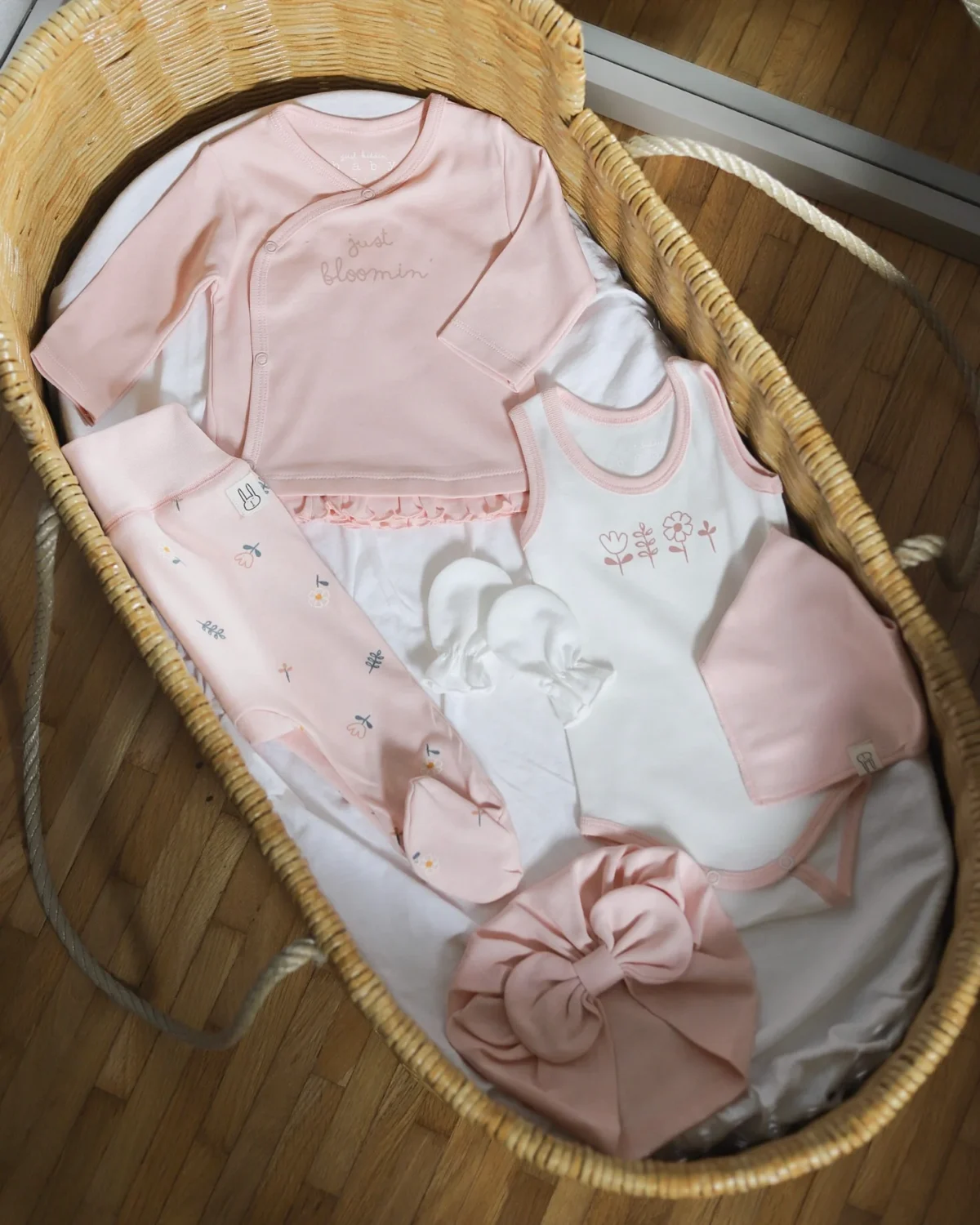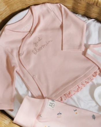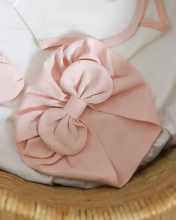 Jedan od retkih setova za devojčice koji u sebi sadrži „turban“ kapicu koju mame obožavaju, deo je nove SunnyBunnyDay kolekcije za proleće! Sadrži 6 komada korisnih za izlazak iz porodilišta i za prvi period sa bebom, a izrađenih od 100% pamuka. U kombinaciji bele i boje kajsije.