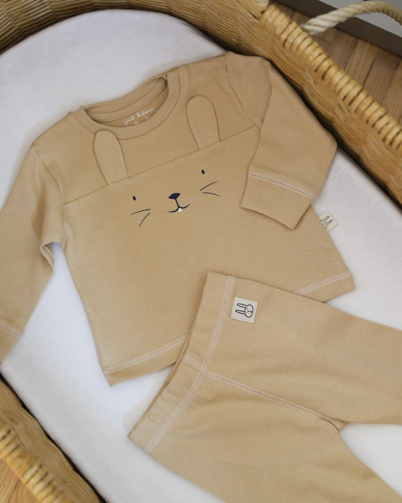 Just Kiddin’ dvodelna pidžamica na dug rukav, izrađena je od nežnog 100% ORGANIC pamuka i idealna za sezonu jesen/zima, ali i kasnije za proleće! U kamel/bež boji, sa zekom.