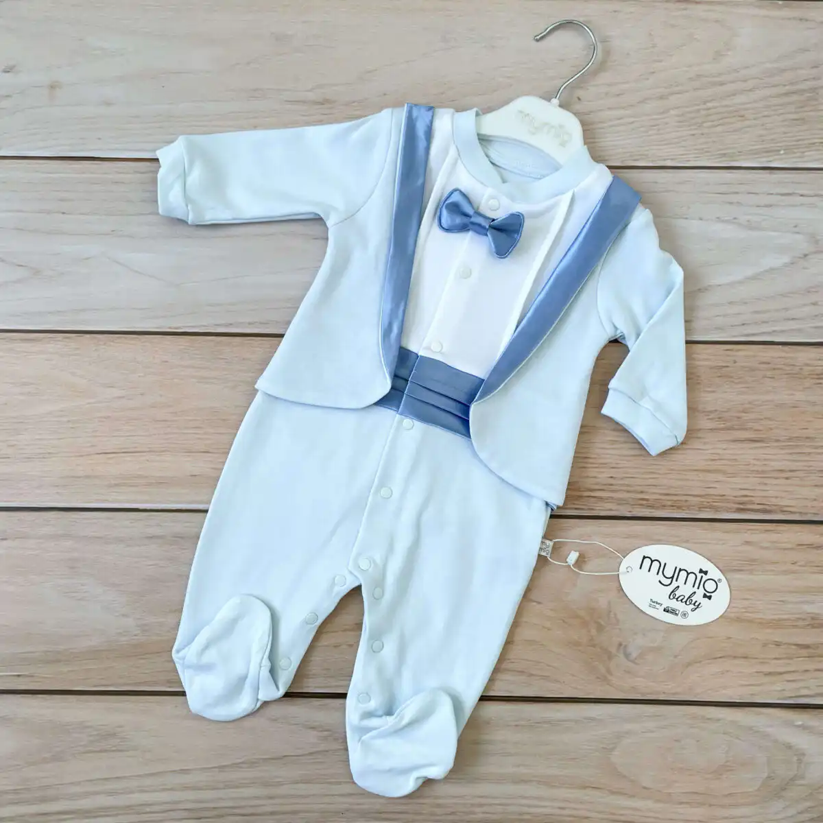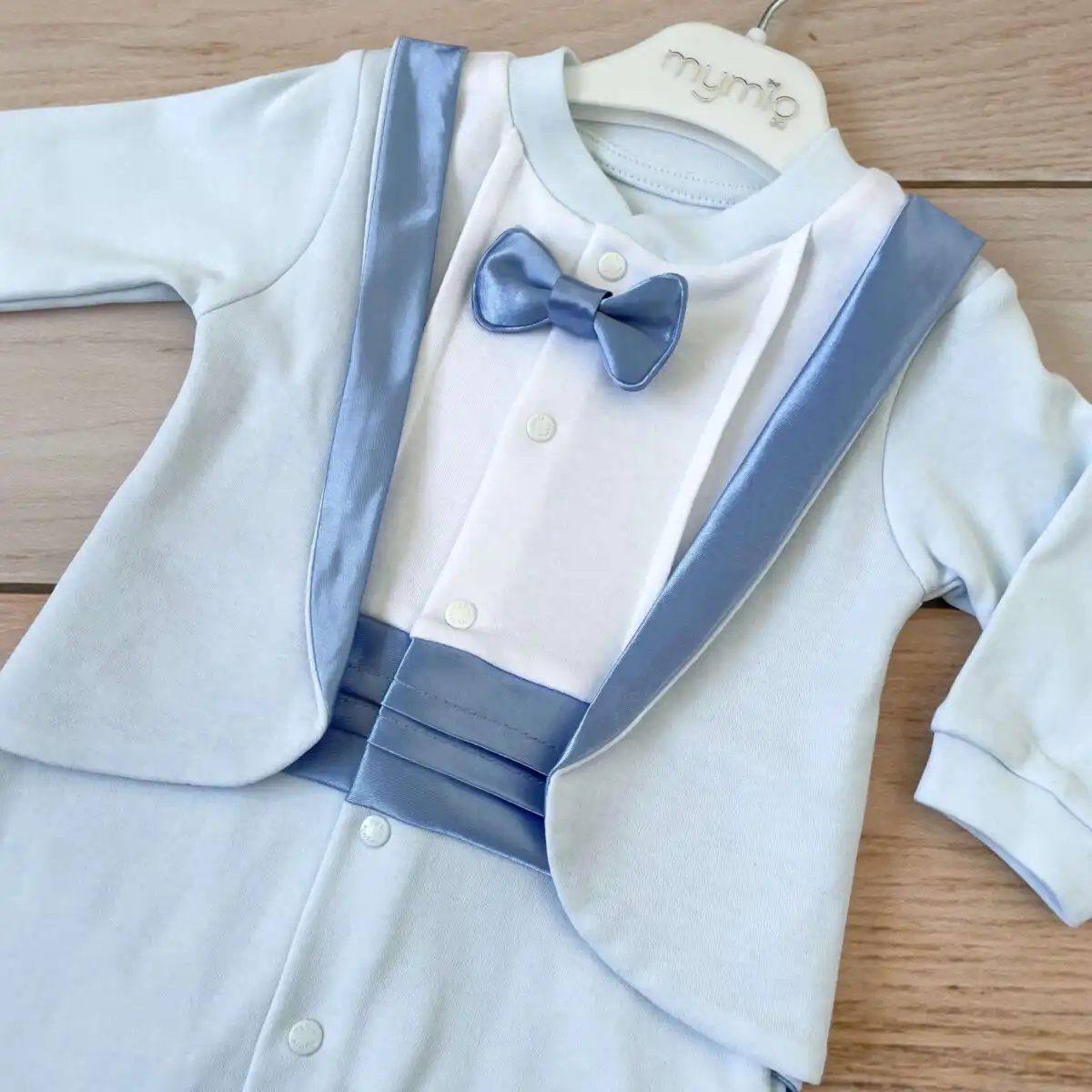 Svetlo plava Mymio štramplica sa leptir mašnom. Raskopčava se celom dužinom i između nogica, na drikere!